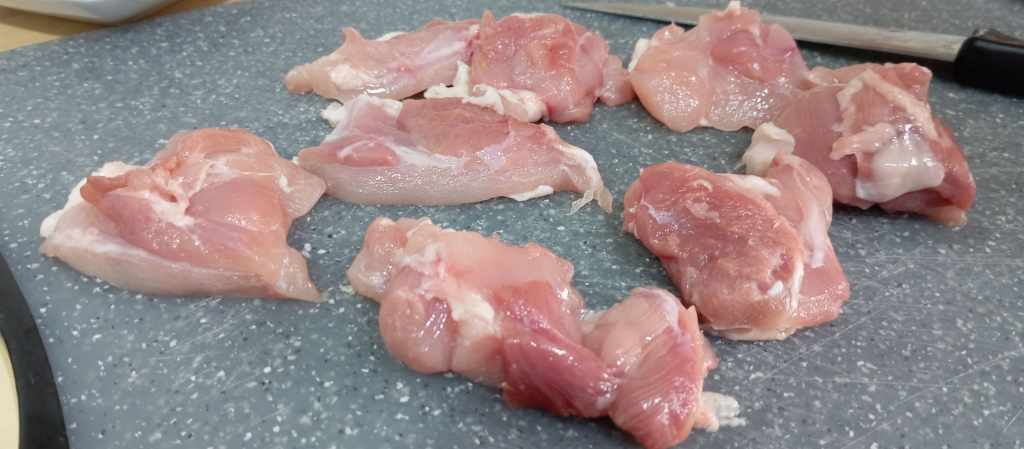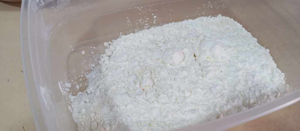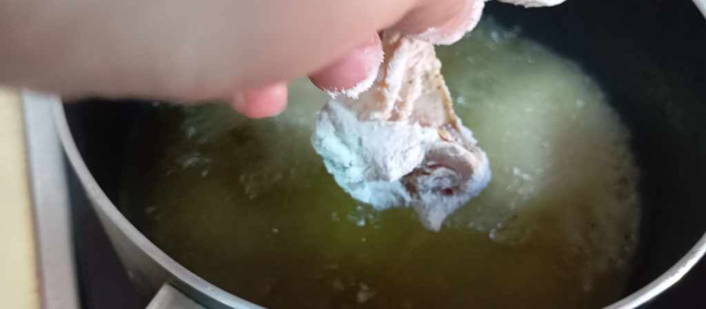 Mezclamos en un tupper las dos harinas y a continuación introducimos el pollo. Cerramos el tupper y agitamos bien para que se rebocen totalmente las piezas del pollo.