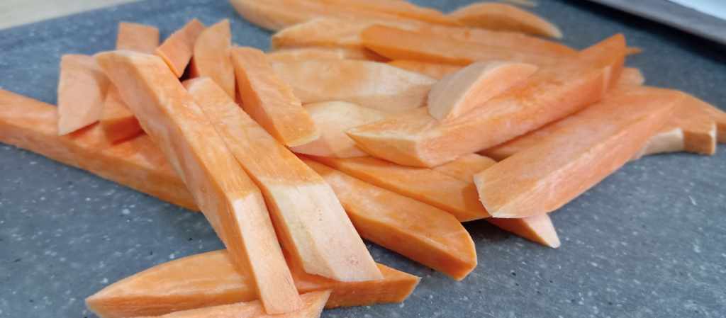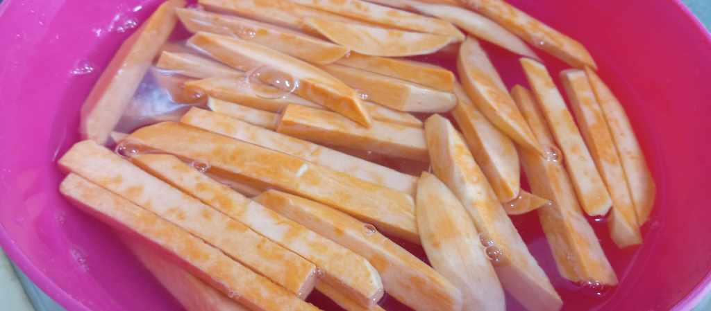 Mientras tanto, vamos a pelar el boniato y a pasarlo por agua fría para retirar posibles restos de tierra que puedan contener. Ahora, vamos a cortarlos en tiras y los colocaremos en un bol con agua fría y sal, para facilitar la fritura posterior.