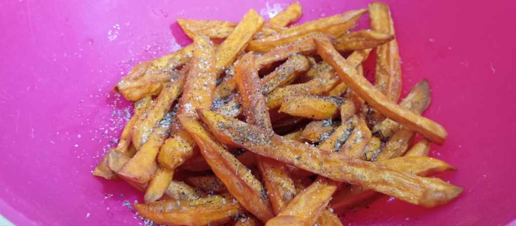 Ponemos abundante aceite de oliva a fuego medio/fuerte y cuando tenga bastante temperatura introducimos las tiras de boniato, dejando freír hasta que estén doradas. Retiramos y colocamos en un bol al que añadiremos sal, pimienta negra y tomillo al gusto para aderezarlo.