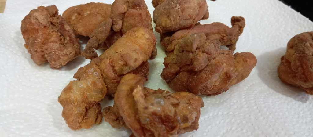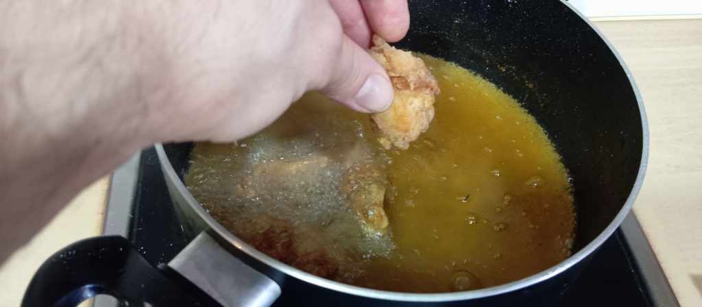 En ese mismo aceite vamos a freír el pollo en varias tandas, empezando a temperatura media/alta y procurando que esta no baje demasiado al introducir una nueva tanda. Retiramos el pollo cuando este tenga un tono dorado y ponemos en papel absorbente para retirar el exceso de aceite.