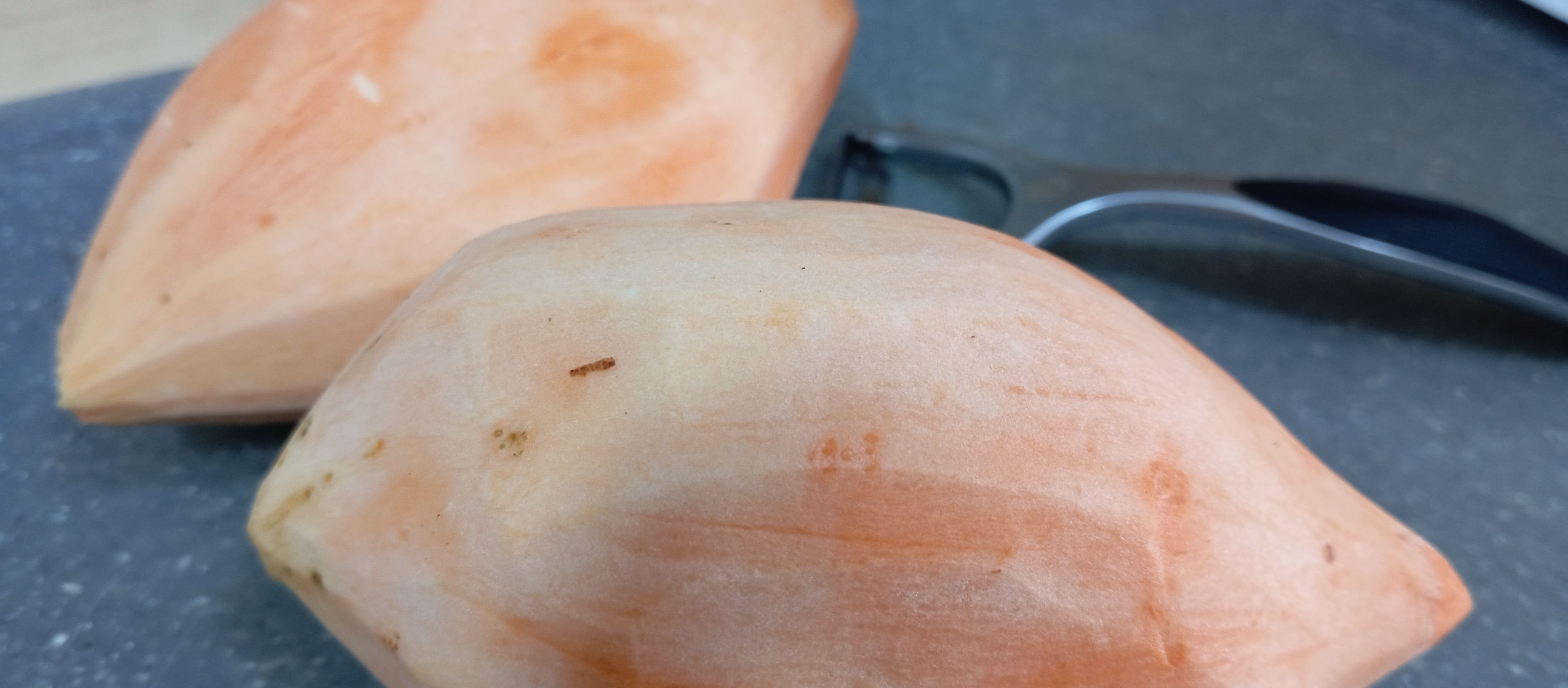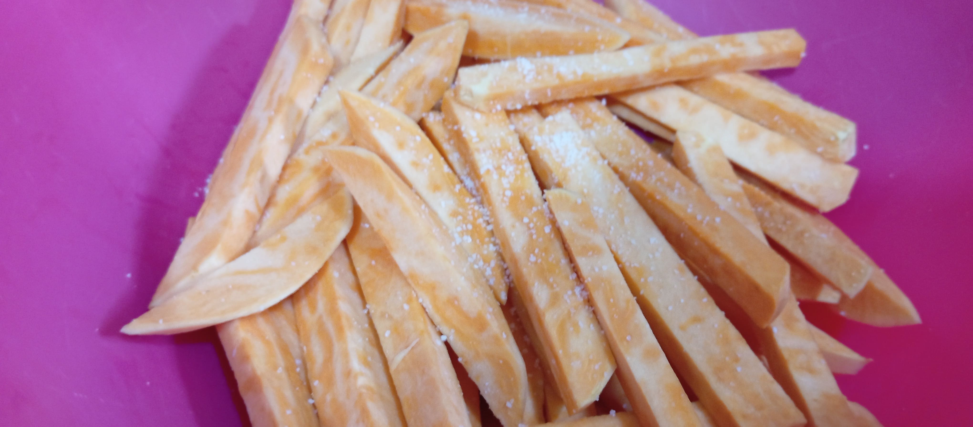 Mientras tanto, vamos a pelar el boniato y a pasarlo por agua fría para retirar posibles restos de tierra que puedan contener. Ahora, vamos a cortarlos en tiras y los colocaremos en un bol con agua fría y sal, para facilitar la fritura posterior.