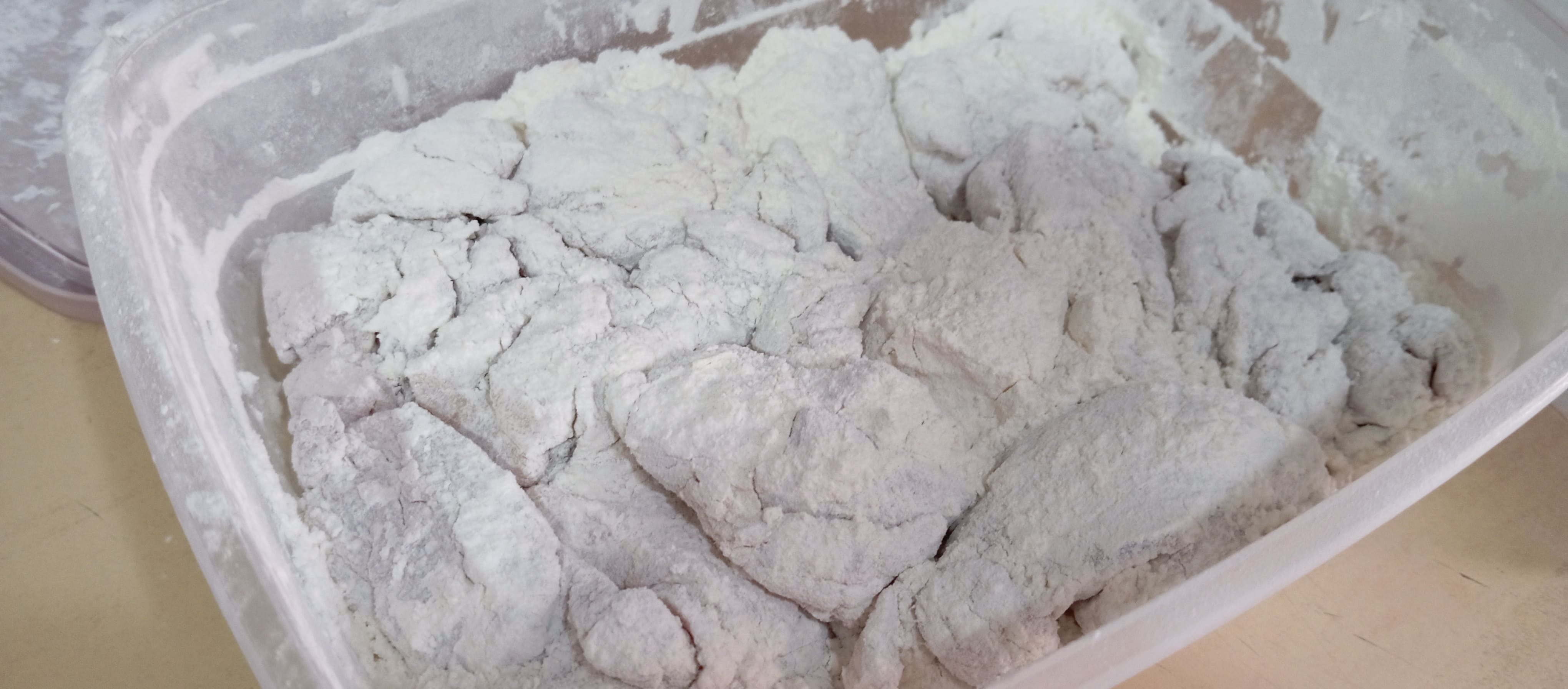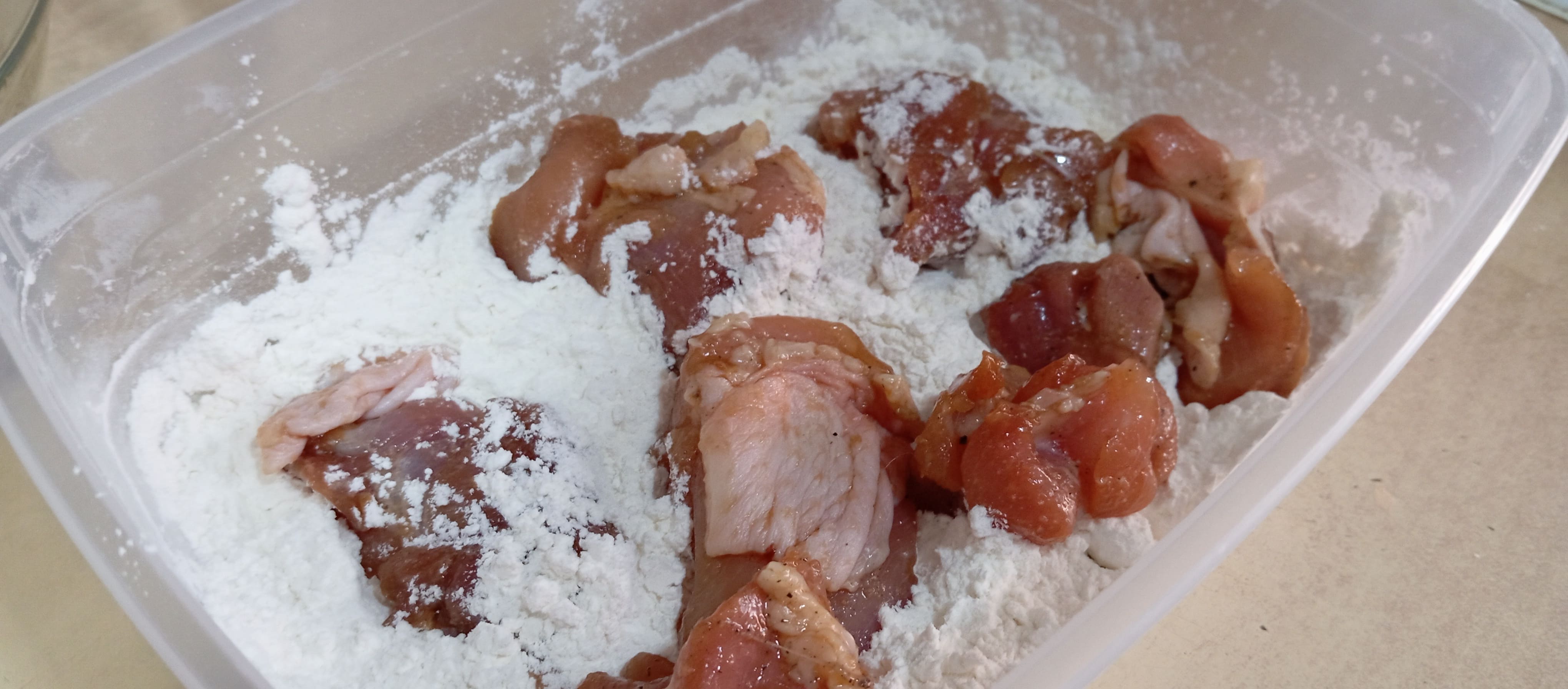 Mezclamos en un tupper las dos harinas y a continuación introducimos el pollo. Cerramos el tupper y agitamos bien para que se rebocen totalmente las piezas del pollo.