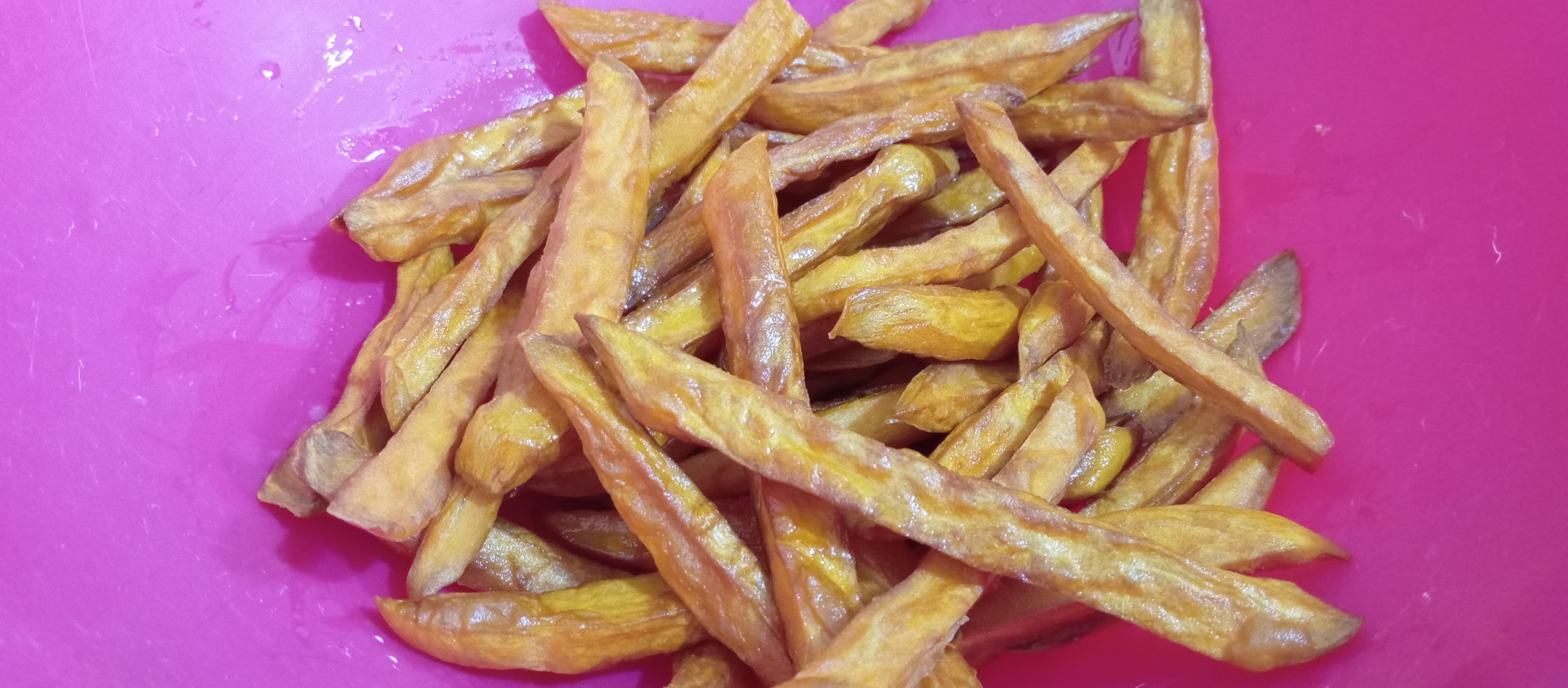 Ponemos abundante aceite de oliva a fuego medio/fuerte y cuando tenga bastante temperatura introducimos las tiras de boniato, dejando freír hasta que estén doradas. Retiramos y colocamos en un bol al que añadiremos sal, pimienta negra y tomillo al gusto para aderezarlo.