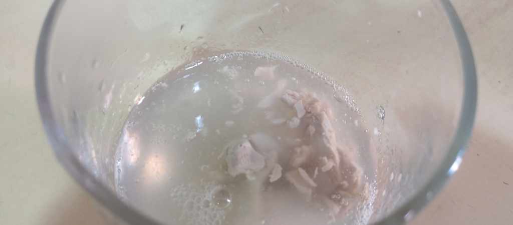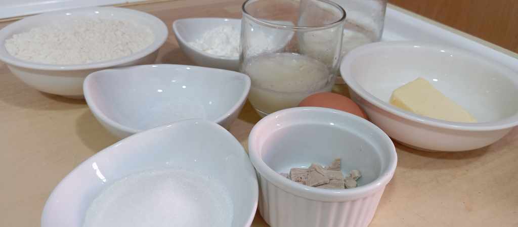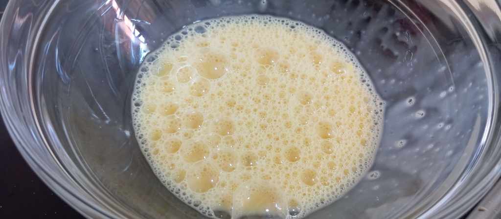 A continuación, vamos a hacer lo siguiente con los ingredientes líquidos, mezclado ahora en un bol la leche y el huevo. Previamente vamos a deshacer la levadura fresca en una mezcla de agua tibia y el zumo de melón hasta que esté completamente disuelta. Añadimos esta mezcla a la de la leche y el huevo y removemos bien.