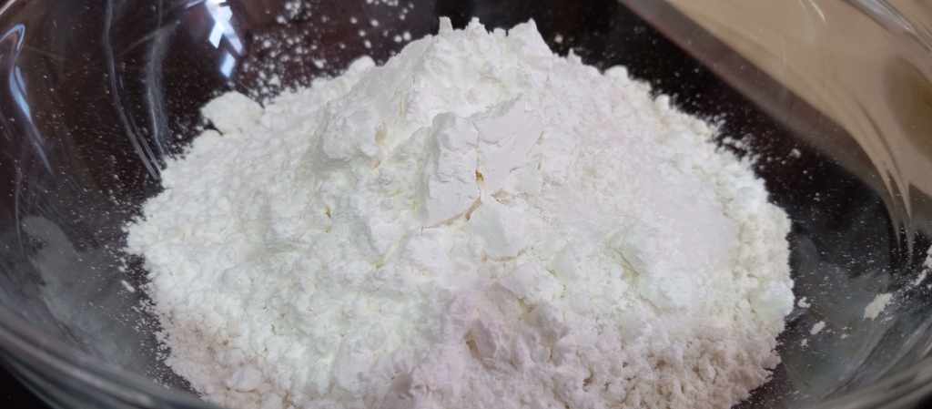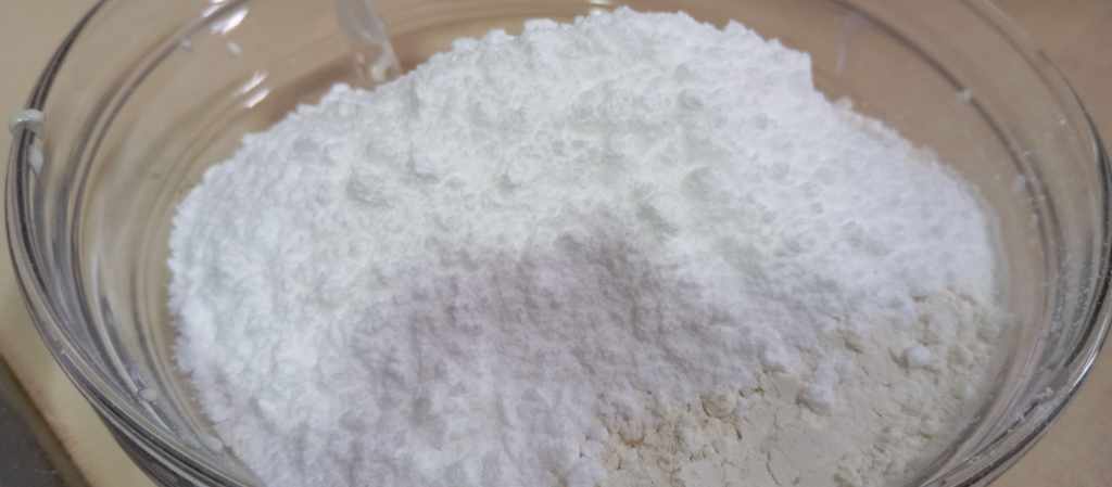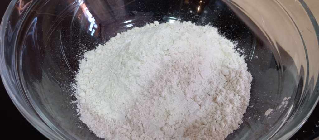Lo primero que haremos será preparar la masa que formará el interior de la elaboración. Para ello vamos a juntar los ingredientes secos, es decir, la harina de trigo, la harina de maíz, la sal y el azúcar, mezclando todo muy bien.