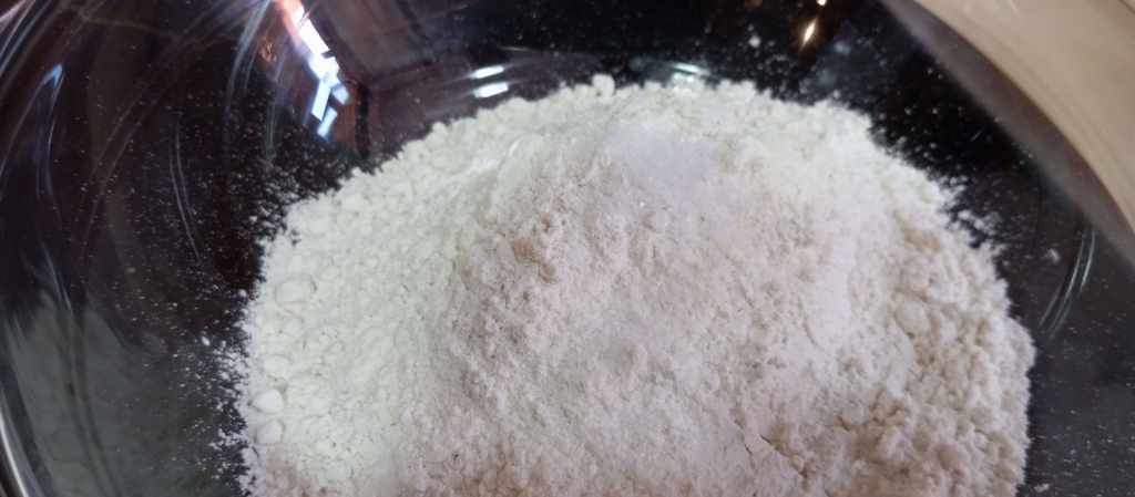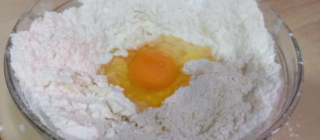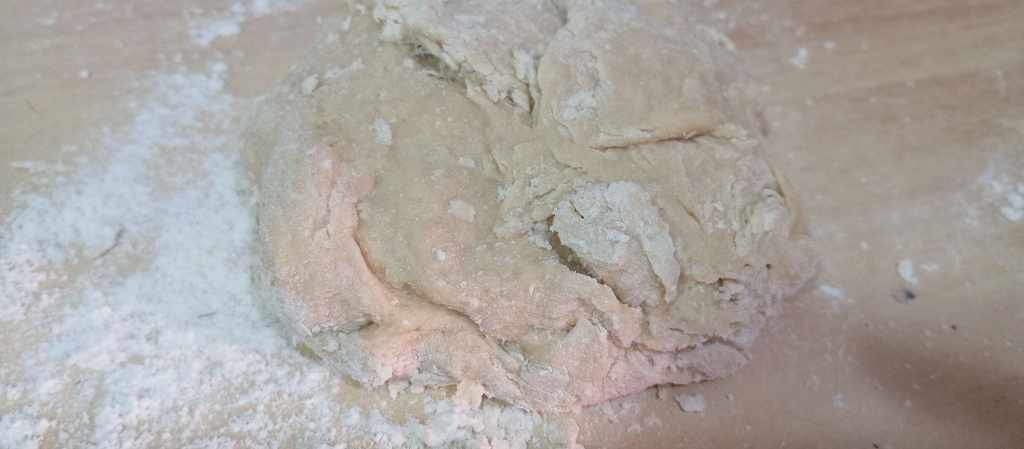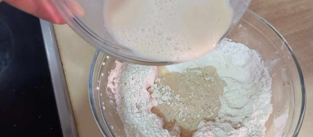 Ahora añadimos la mezcla de líquidos con los ingredientes solido haciendo un volcán justo en el medio del bol e iremos añadiendo poco a poco para ir mezclando todo hasta obtener una masa que pueda estirarse y no quede pegajosa. Si esto no llega a ser así podemos ir añadiendo harina hasta que alcance la textura que queremos.