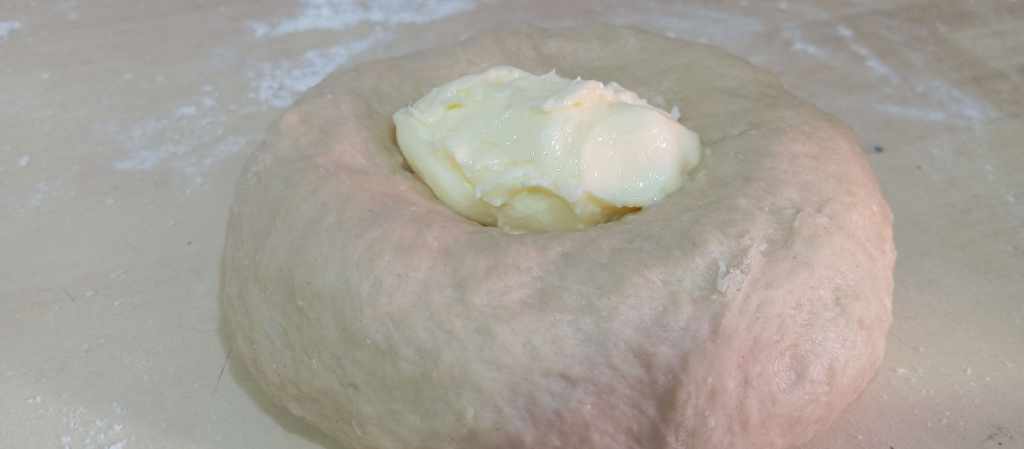 Sacamos la masa del bol y en una superficie limpia en la que vamos a espolvorear un poquito de harina y donde colocaremos la masa haciendo en el medio de esta un agujero donde colocaremos la mantequilla empomada para que se mezcle con esta al ir amasándola y poder formar una bola consistente. En este momento vamos a colocarla en otro bol más grande y la dejaremos fermentar durante 2 horas a temperatura ambiente.