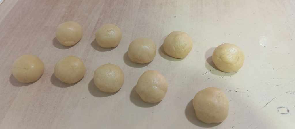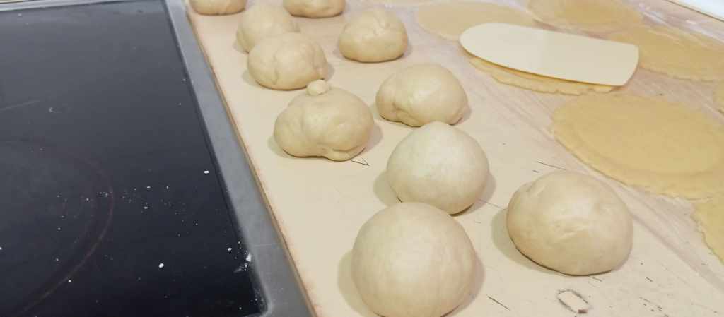 Cuando ya hayan pasado las dos horas de fermentación vamos a retirar la masa del bol y la vamos a dividir también en 10 piezas que bolearemos para conseguir piezas de unos 35 grs.