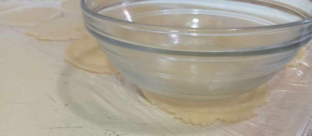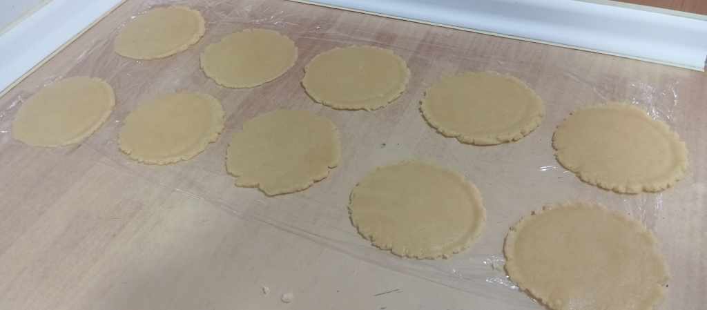 Una vez formadas las bolas vamos a colocarlas sobre papel film y aplastarlas con la ayuda de un bol, plato o bandeja, de forma que nos queden con forma de discos de un grosor aproximado de unos 2 milímetros. Ya formados, vamos a taparlas con otra capa de film y las dejaremos reposar durante el tiempo restante que le quede a la masa interior.