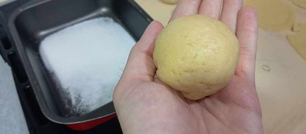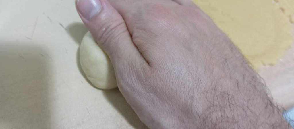 Ya formadas vamos a retirar el papel film y sacaremos con cuidado los discos de la masa exterior y cubriendo con estos las bolas de masa interior, momento en el que las cerraremos con cuidado para evitar que se rompa la masa.