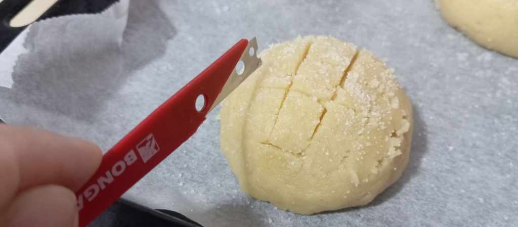 Ahora, vamos a poner en una bandeja o bol los 50 grs de azúcar blanco y rebozaremos un poco las piezas. Seguidamente y con la ayuda de una cuchilla de panadería (o también nos vale un cuchillo normal) vamos a darle una serie de cortes horizontales y luego transversales para que queden formas cuadradas en la masa. Una vez hechos los cortes vamos a colocar las bolas de masa en una bandeja de horno en la que habremos puesto papel de horneado. Mientras vamos rebozando todas iremos precalentado el horno a 190ºC.