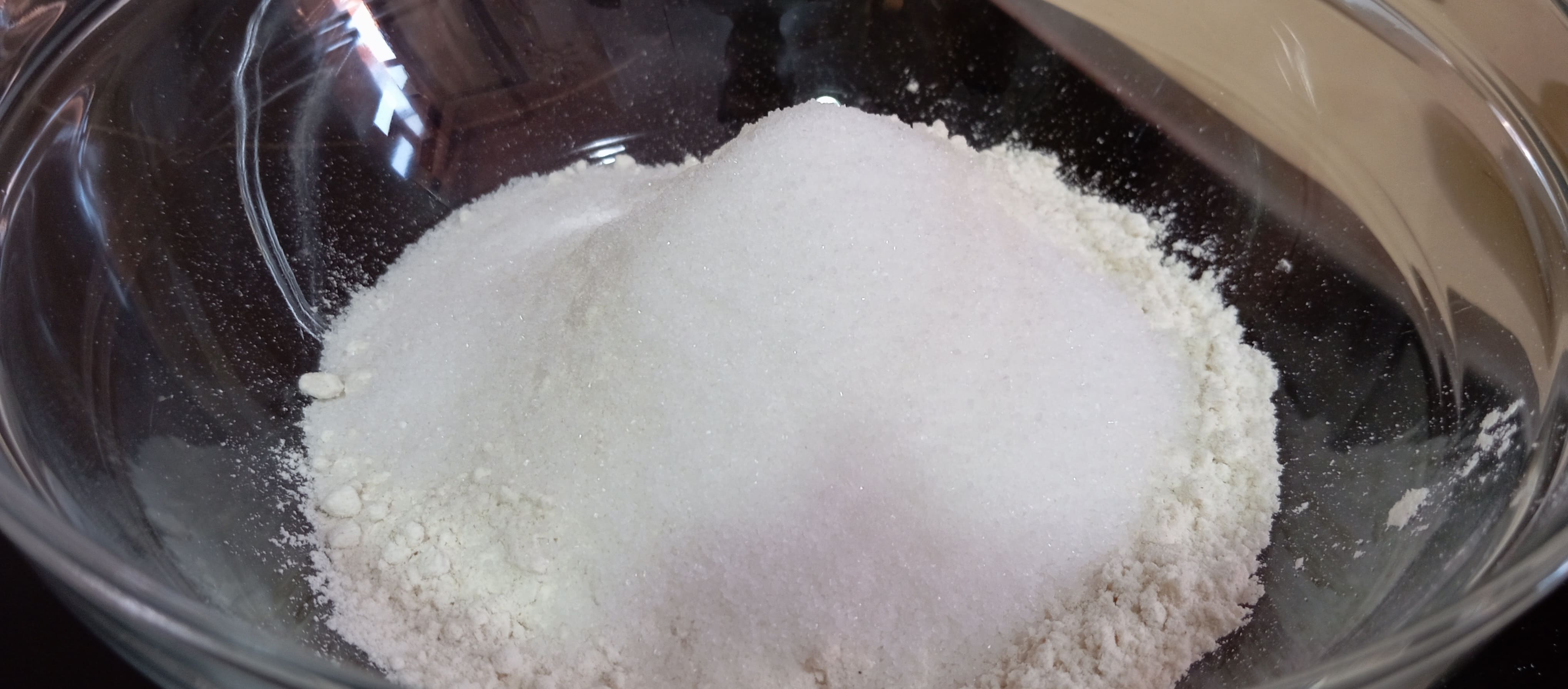 Lo primero que haremos será preparar la masa que formará el interior de la elaboración. Para ello vamos a juntar los ingredientes secos, es decir, la harina de trigo, la harina de maíz, la sal y el azúcar, mezclando todo muy bien.