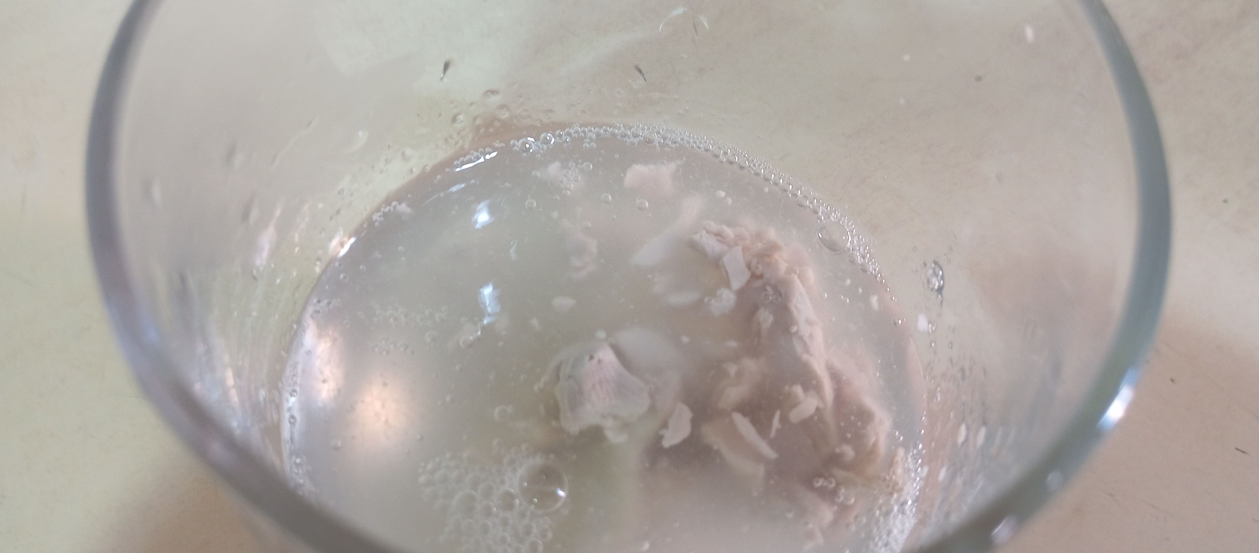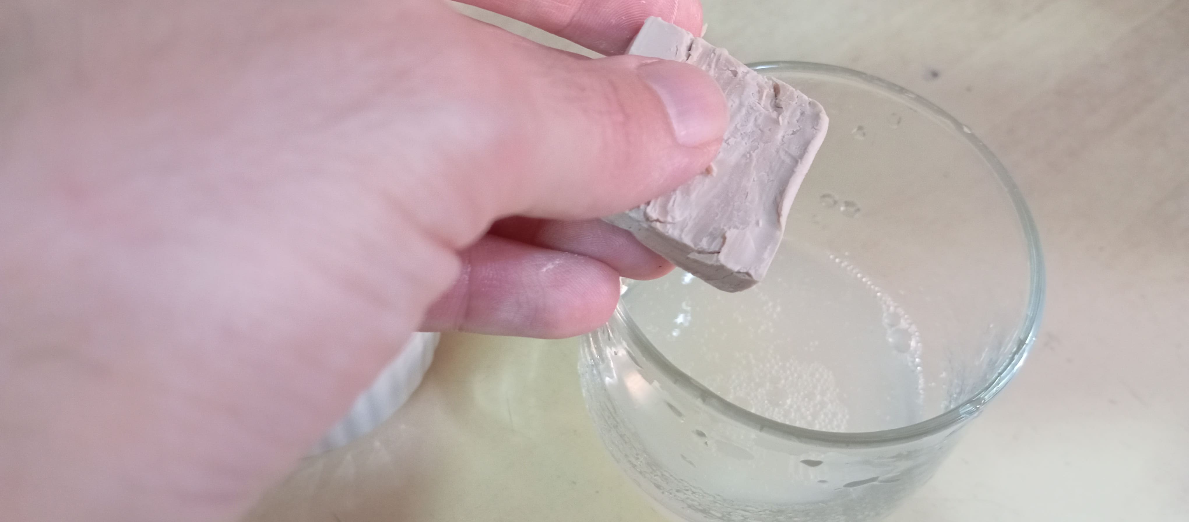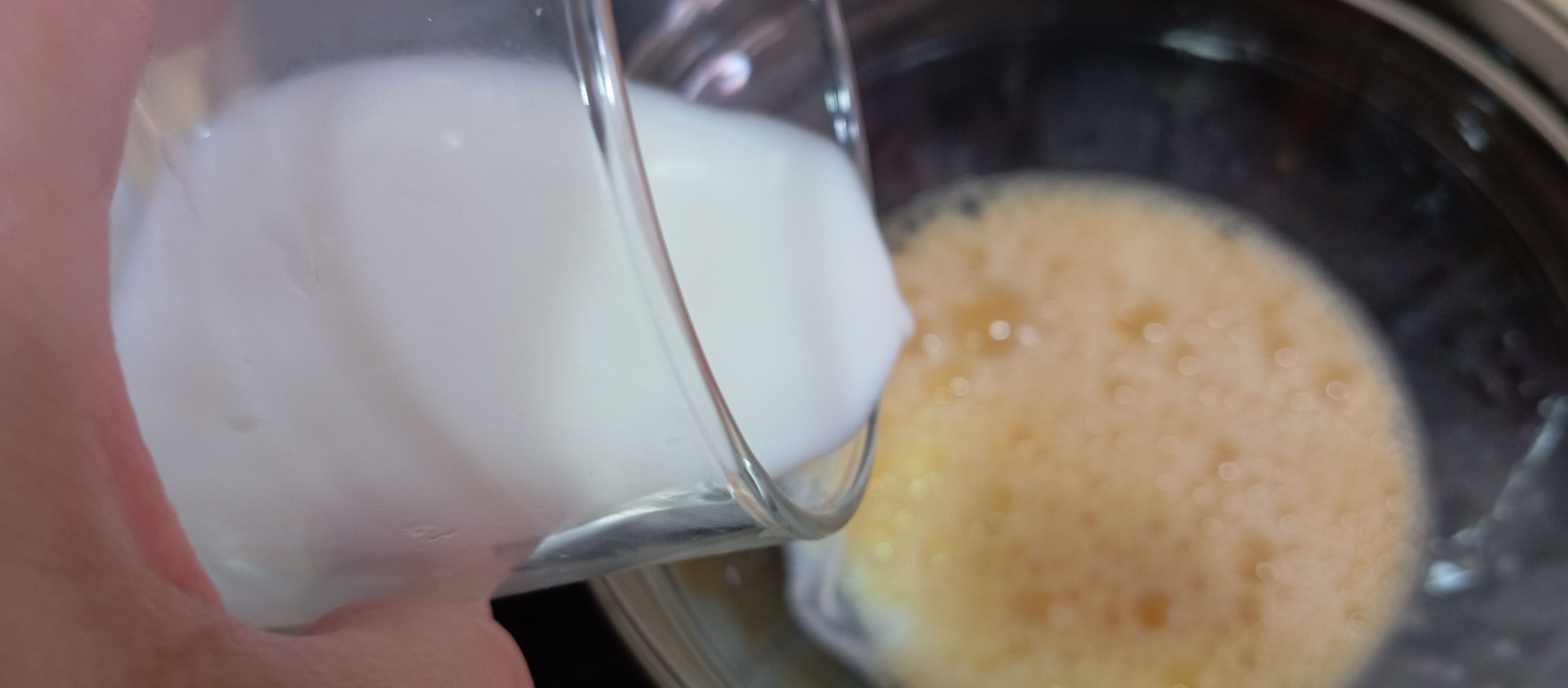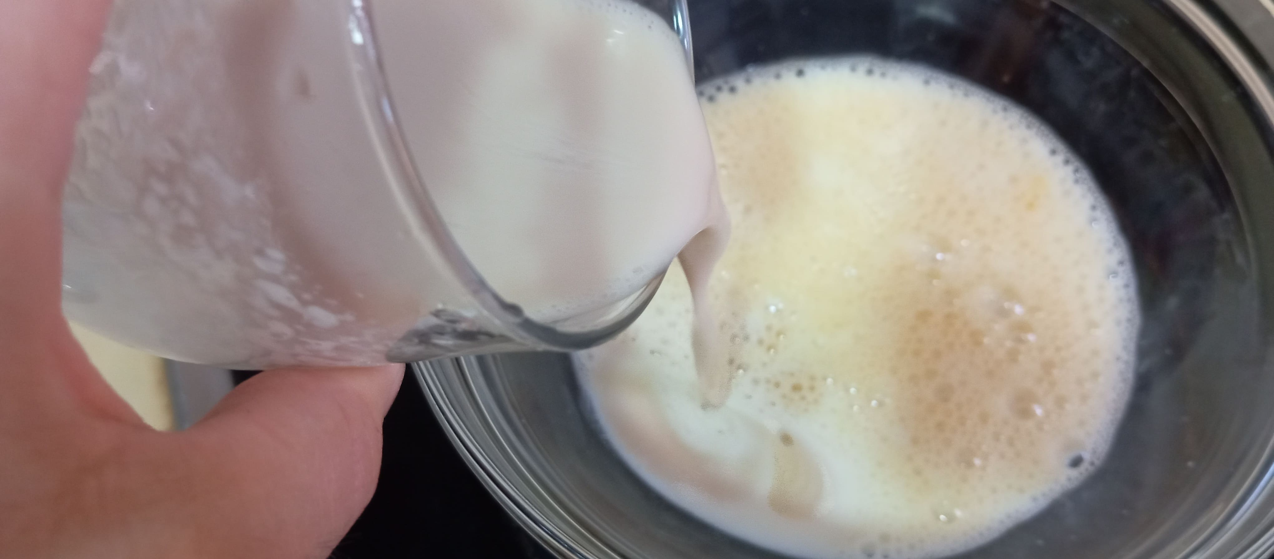 A continuación, vamos a hacer lo siguiente con los ingredientes líquidos, mezclado ahora en un bol la leche y el huevo. Previamente vamos a deshacer la levadura fresca en una mezcla de agua tibia y el zumo de melón hasta que esté completamente disuelta. Añadimos esta mezcla a la de la leche y el huevo y removemos bien.
