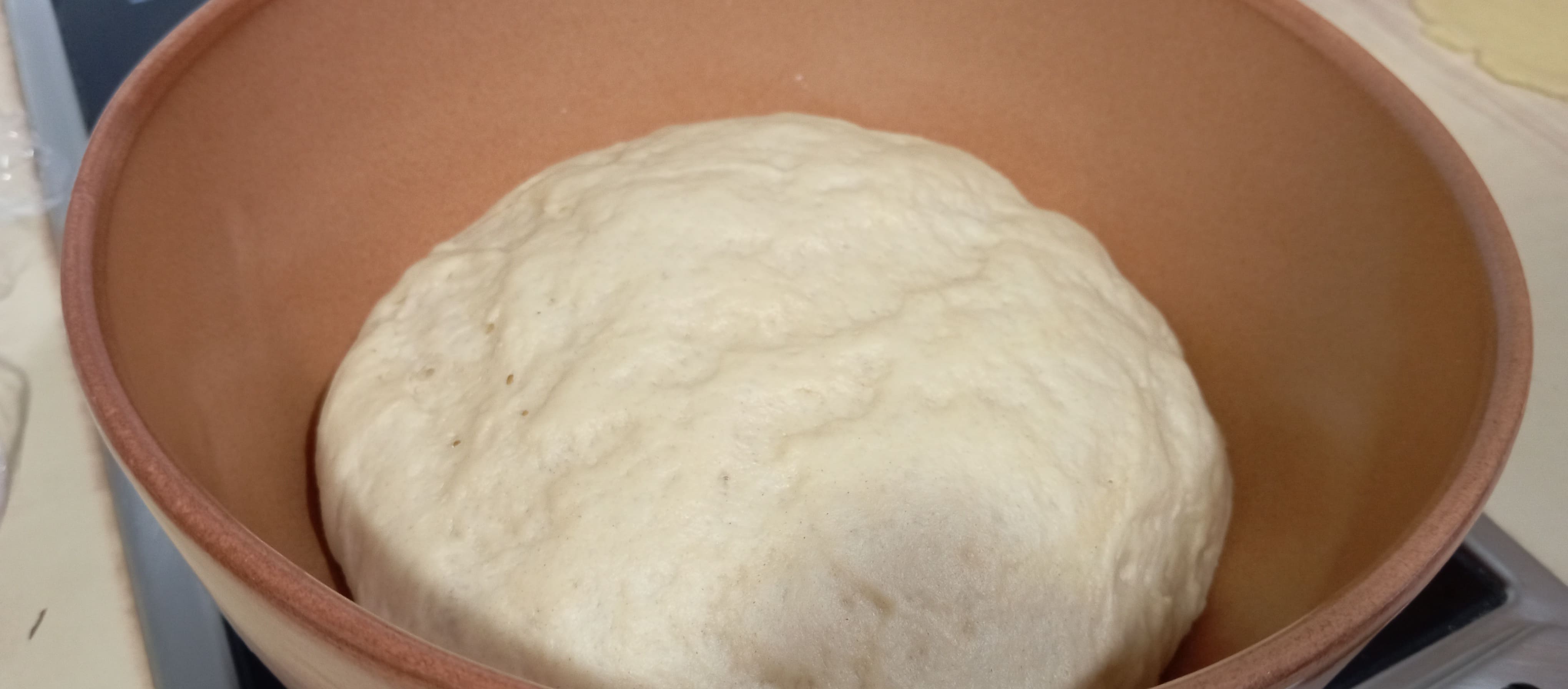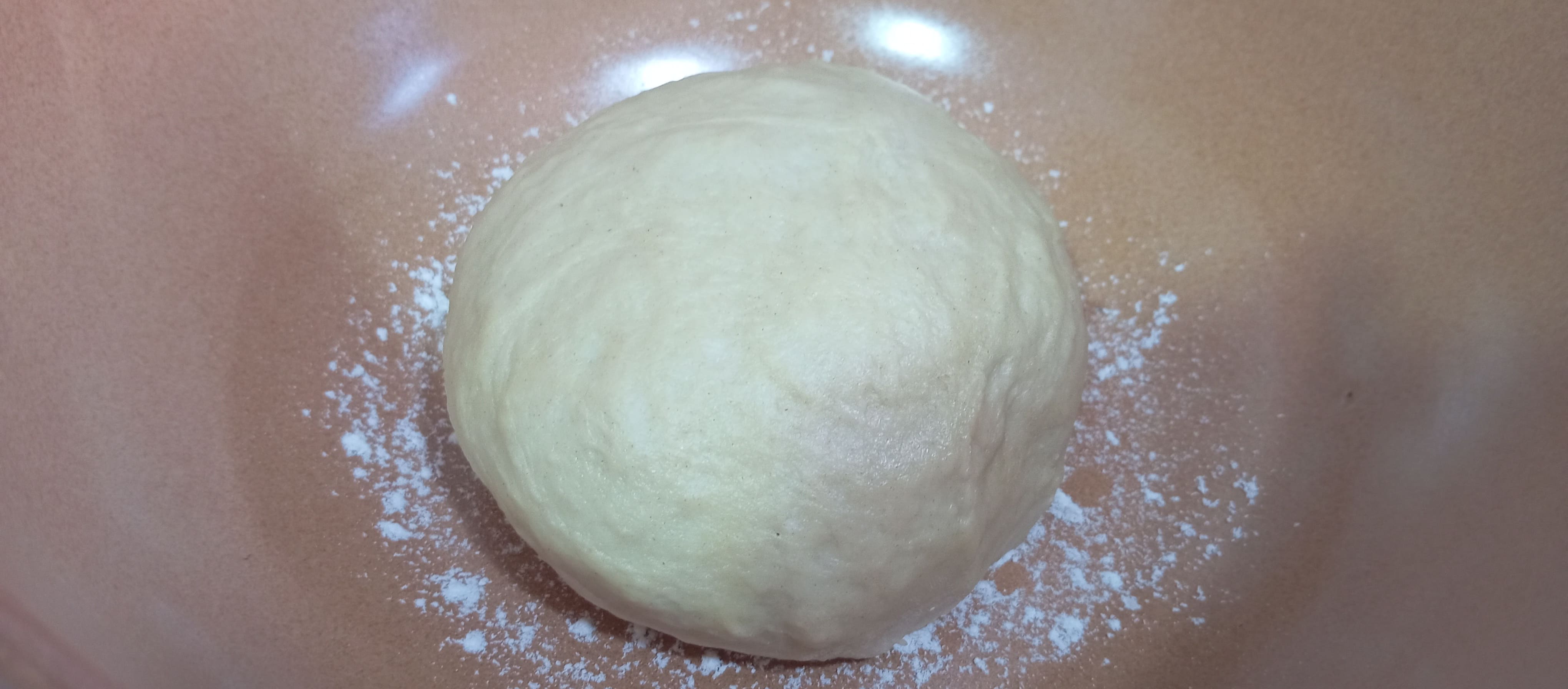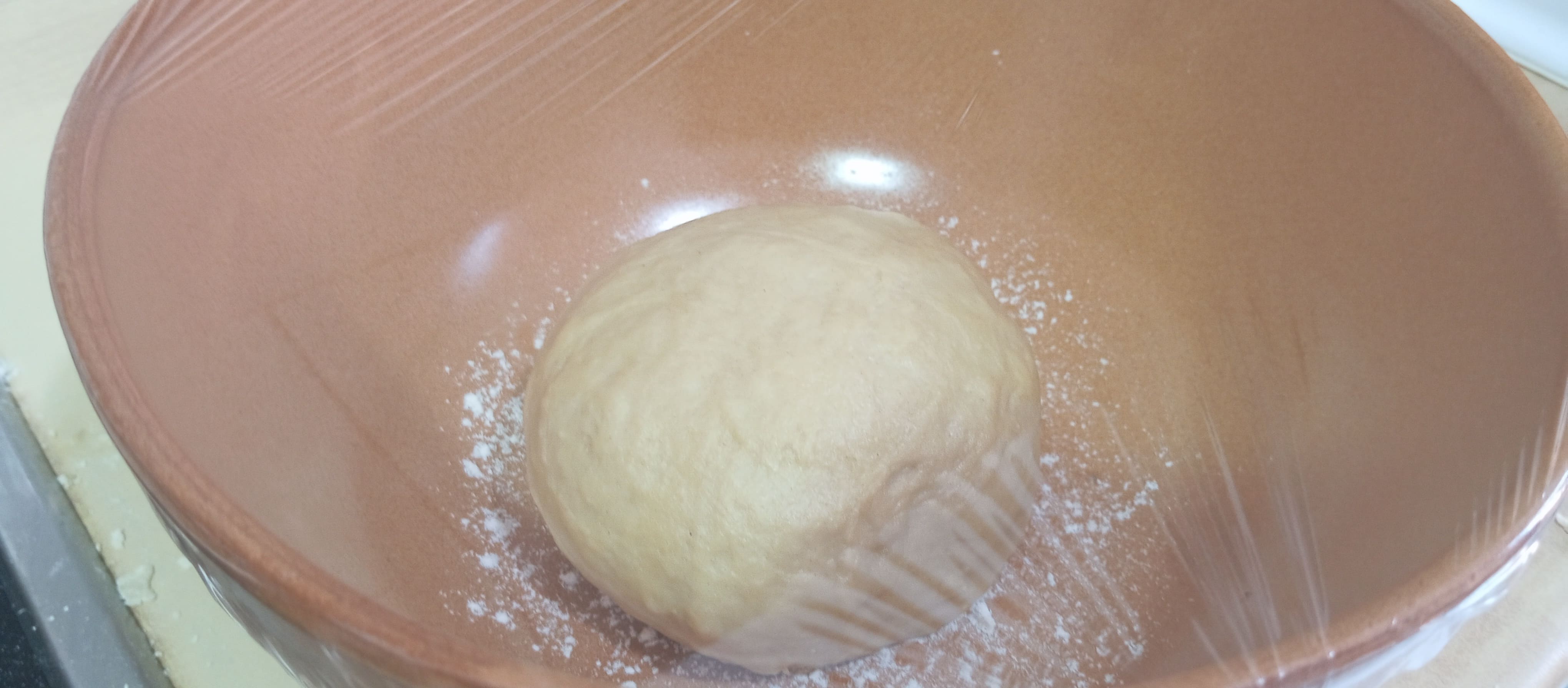 Sacamos la masa del bol y en una superficie limpia en la que vamos a espolvorear un poquito de harina y donde colocaremos la masa haciendo en el medio de esta un agujero donde colocaremos la mantequilla empomada para que se mezcle con esta al ir amasándola y poder formar una bola consistente. En este momento vamos a colocarla en otro bol más grande y la dejaremos fermentar durante 2 horas a temperatura ambiente.