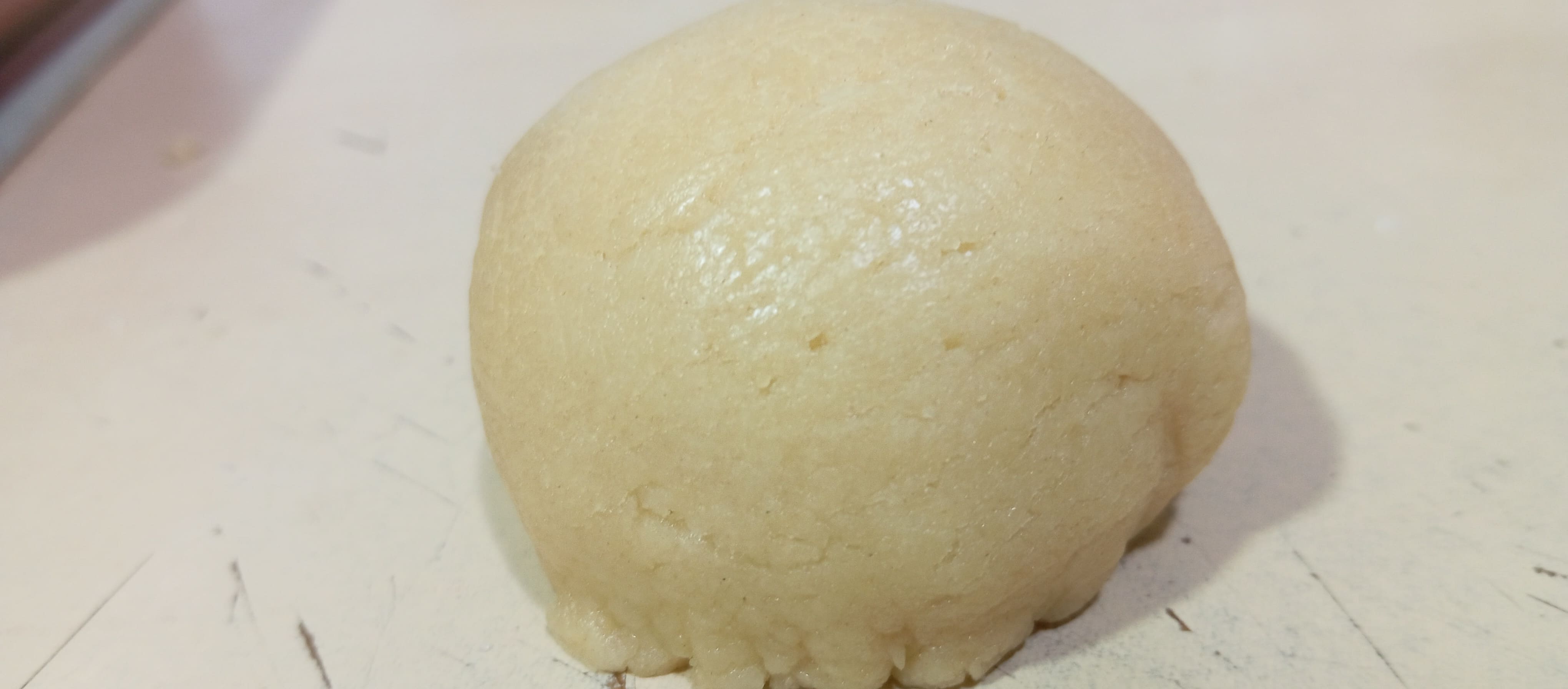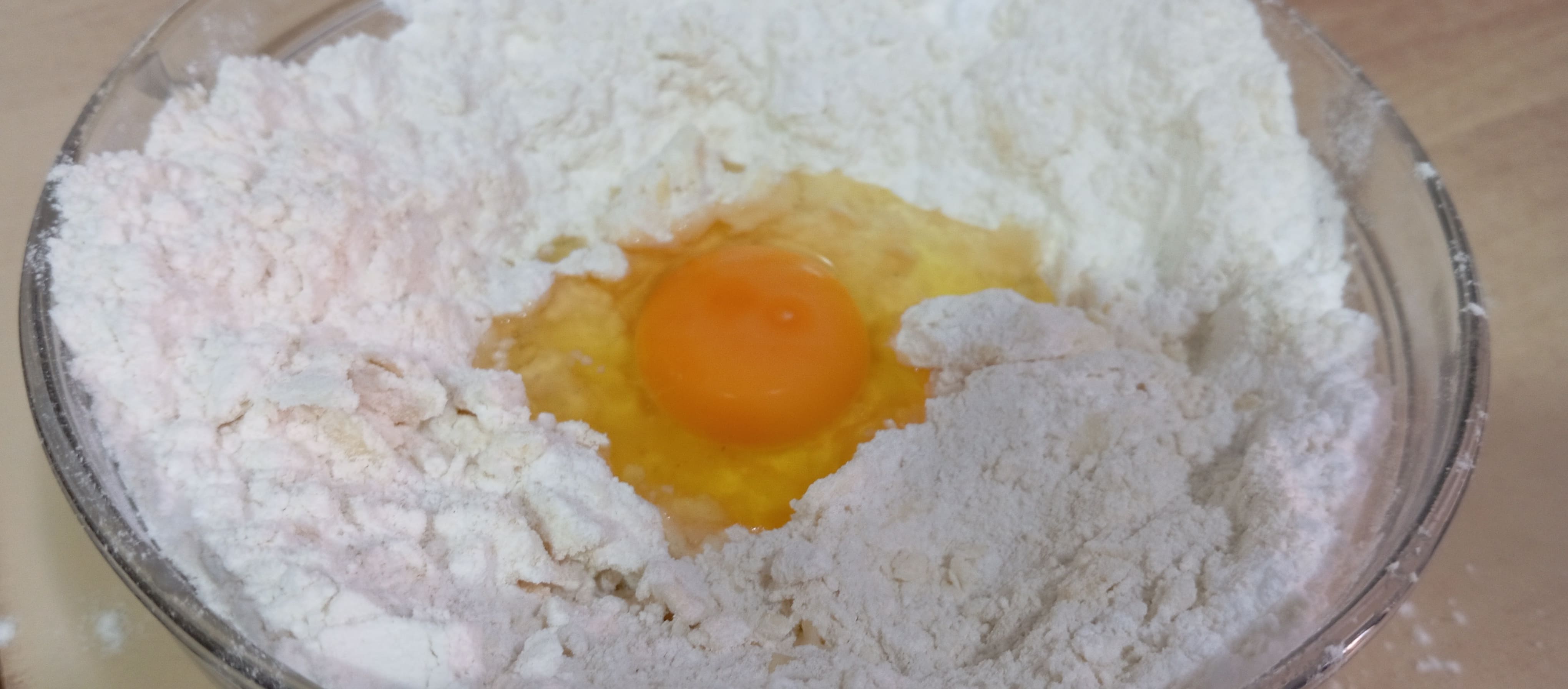 Ahora añadimos la mezcla de líquidos con los ingredientes solido haciendo un volcán justo en el medio del bol e iremos añadiendo poco a poco para ir mezclando todo hasta obtener una masa que pueda estirarse y no quede pegajosa. Si esto no llega a ser así podemos ir añadiendo harina hasta que alcance la textura que queremos.