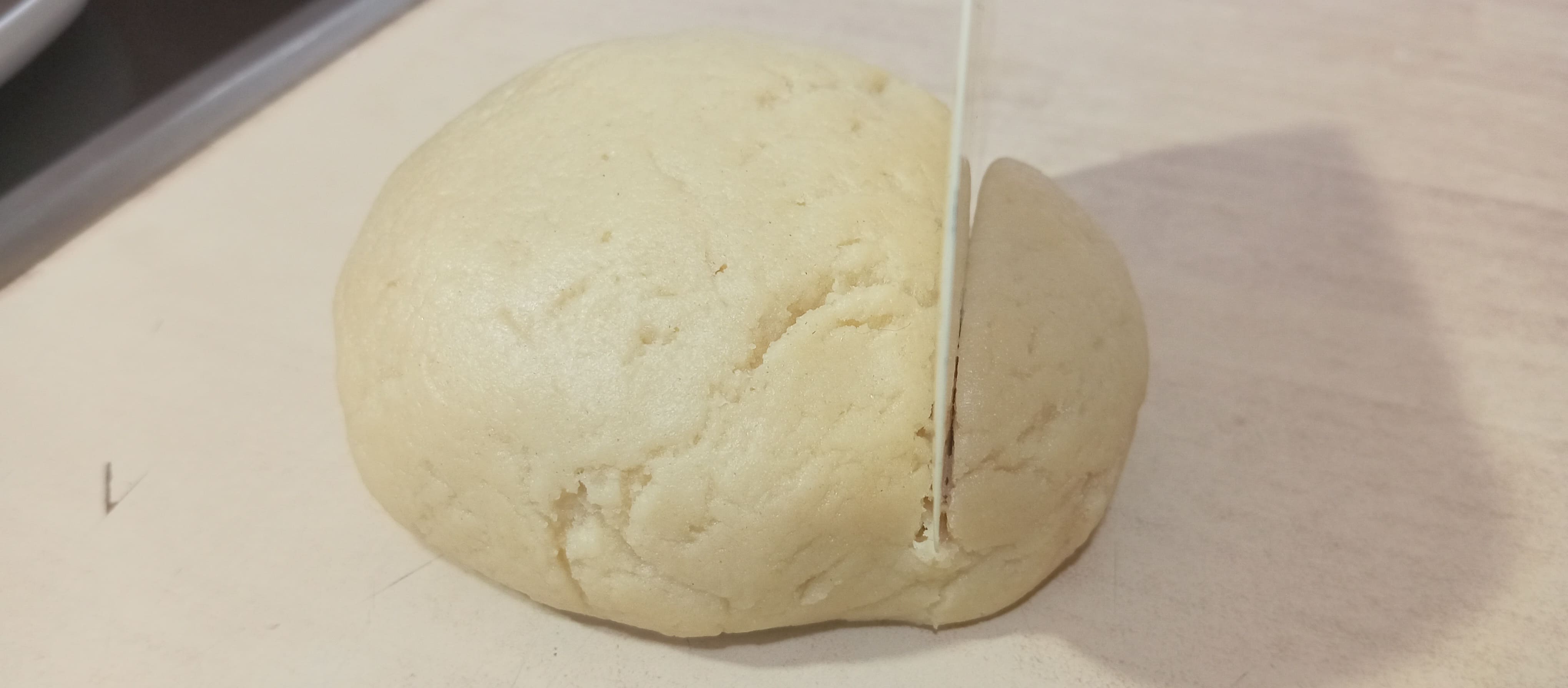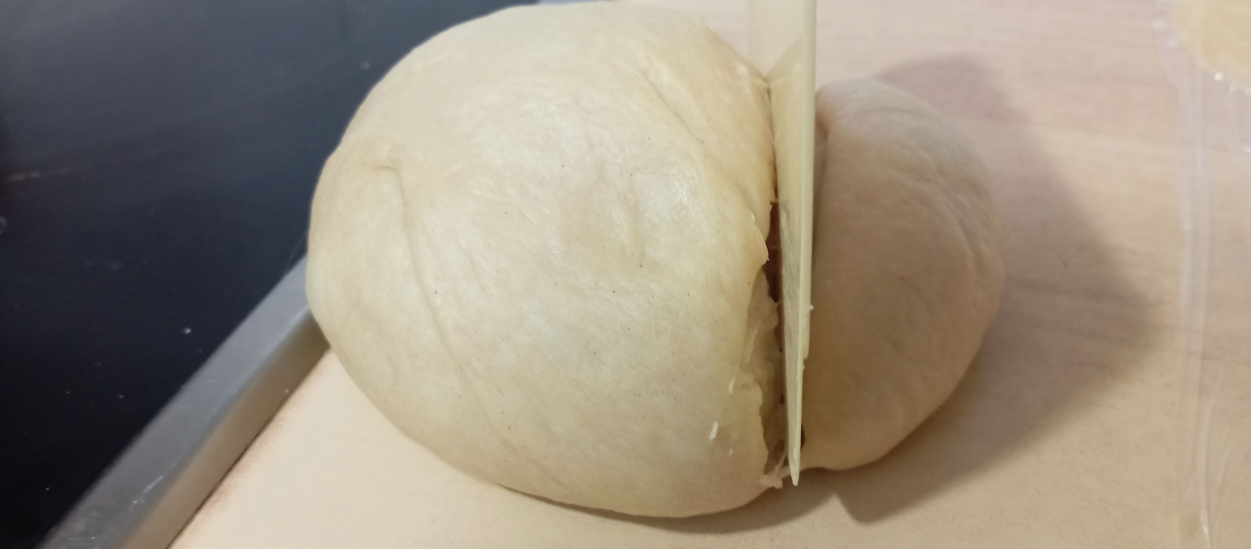 Retiramos la masa del bol y la sacamos a una superficie limpia en la que pondremos un poco de harina de trigo para que al manejar la masa se nos pegue lo menos posible. Ahora, vamos a dividirla en 10 piezas de unos 42 grs aproximadamente o que queden lo más parecidas posible en cuanto a tamaño se refiere.