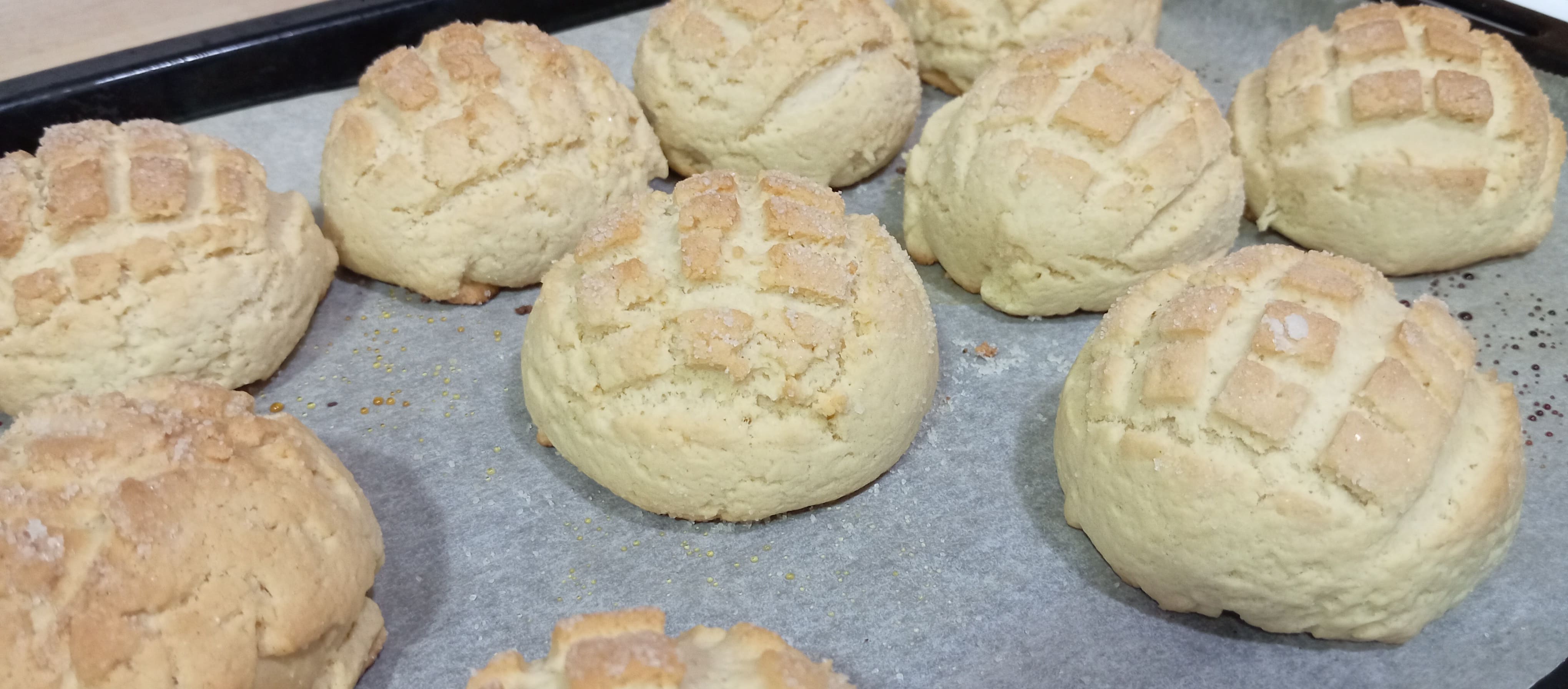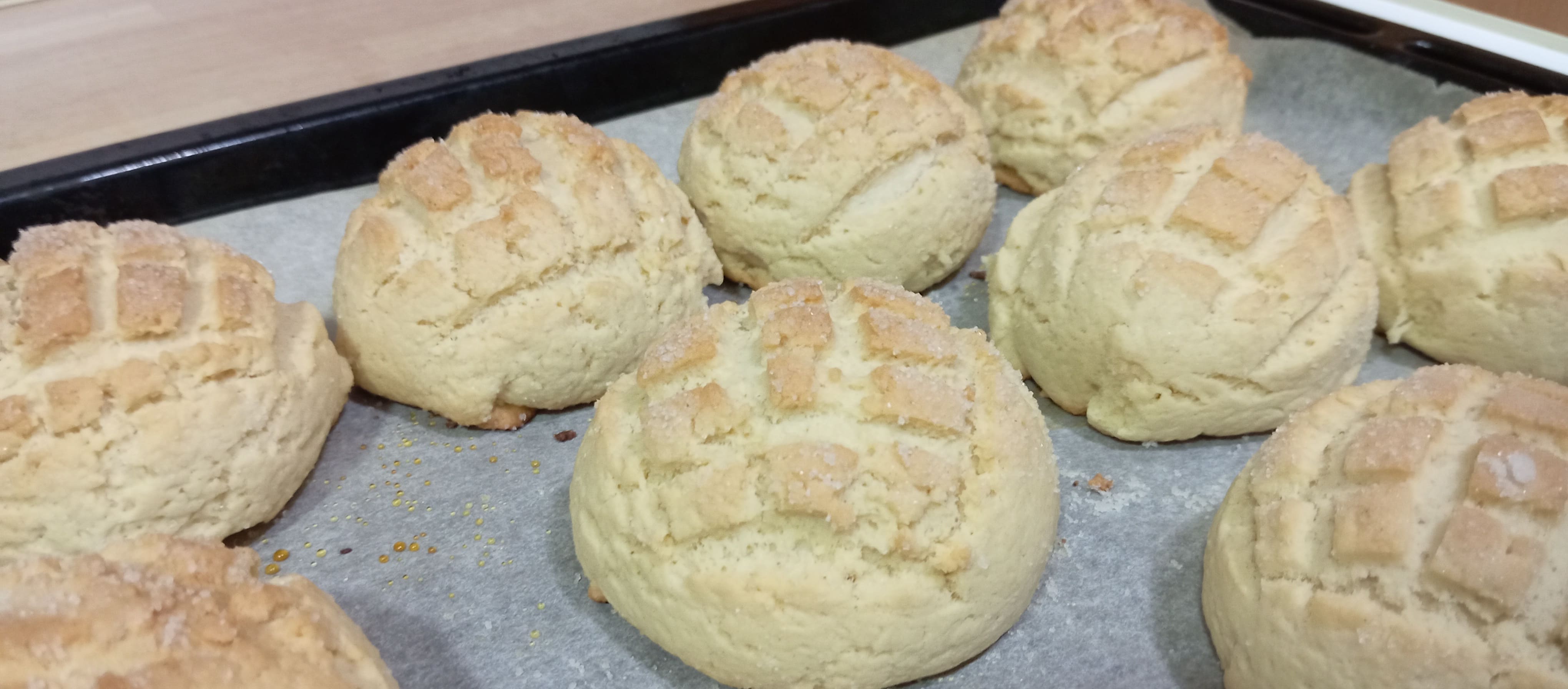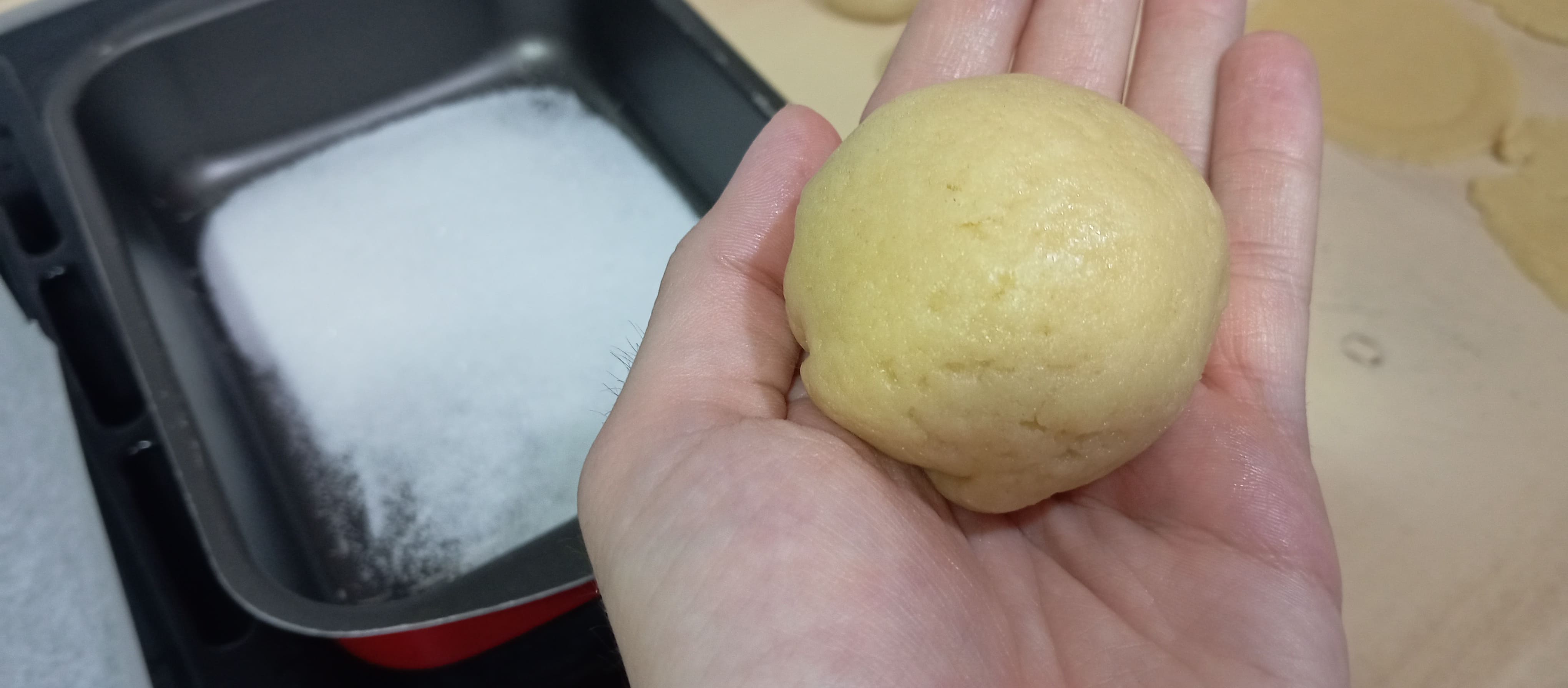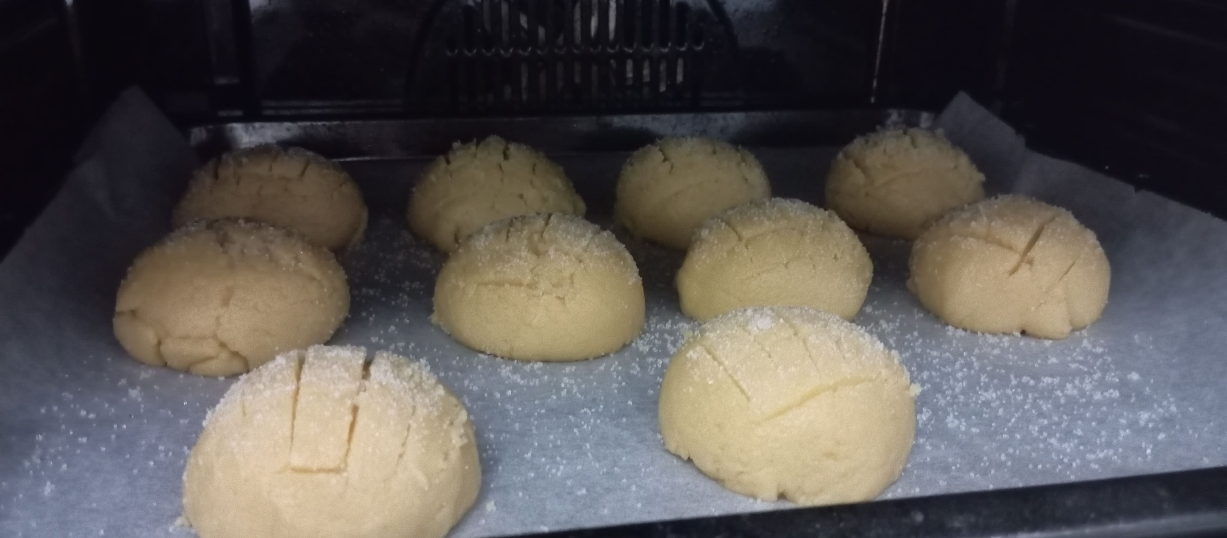 Ahora, vamos a poner en una bandeja o bol los 50 grs de azúcar blanco y rebozaremos un poco las piezas. Seguidamente y con la ayuda de una cuchilla de panadería (o también nos vale un cuchillo normal) vamos a darle una serie de cortes horizontales y luego transversales para que queden formas cuadradas en la masa. Una vez hechos los cortes vamos a colocar las bolas de masa en una bandeja de horno en la que habremos puesto papel de horneado. Mientras vamos rebozando todas iremos precalentado el horno a 190ºC.
