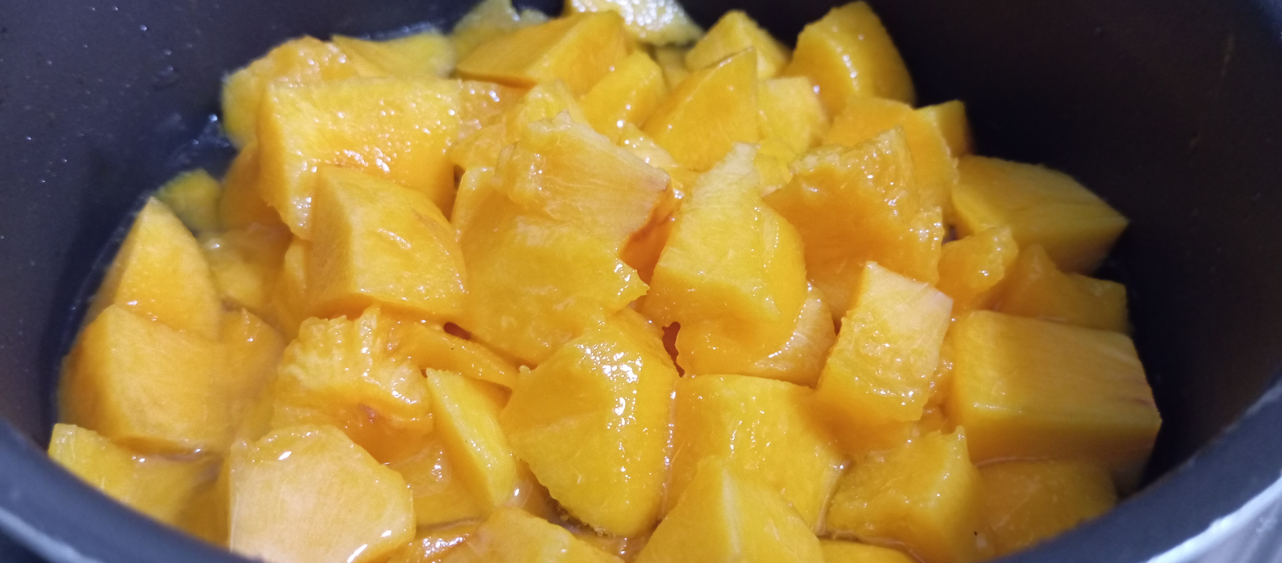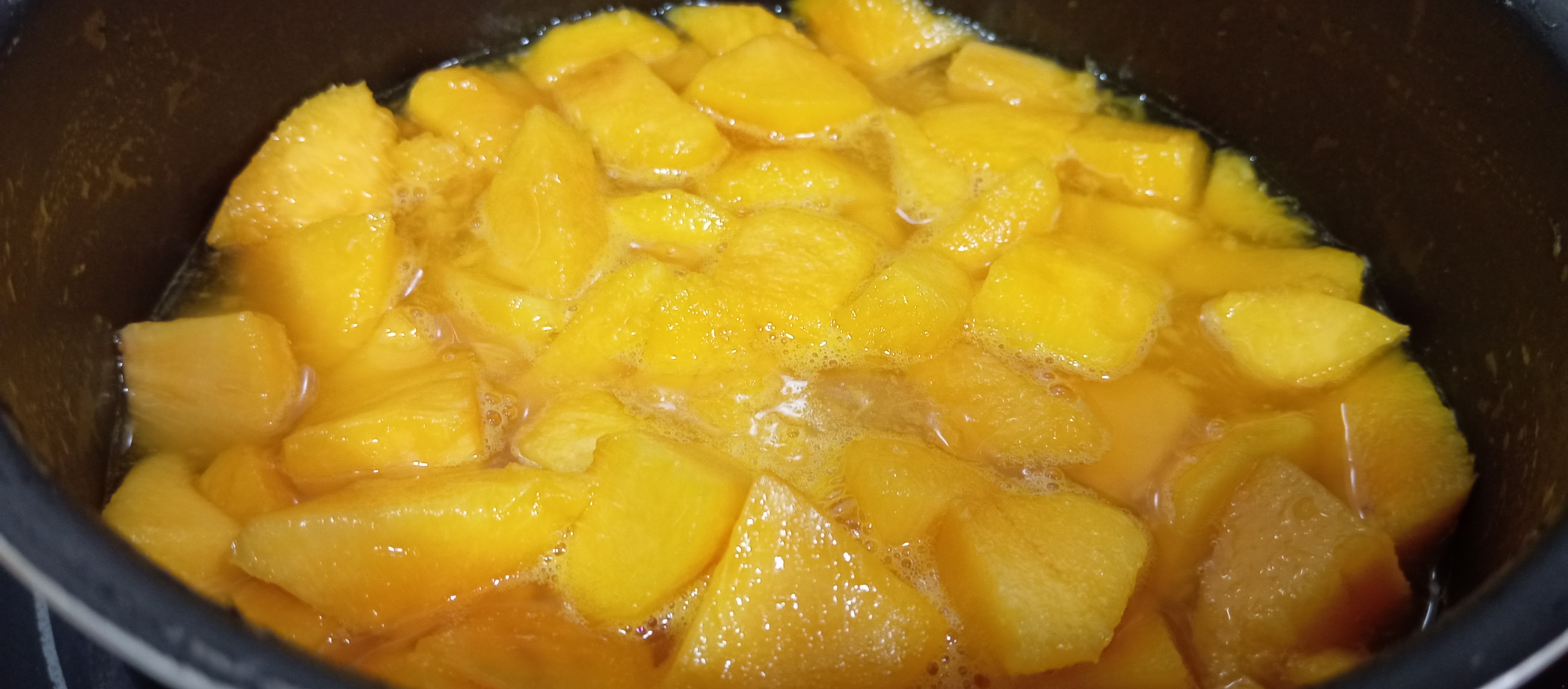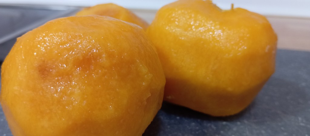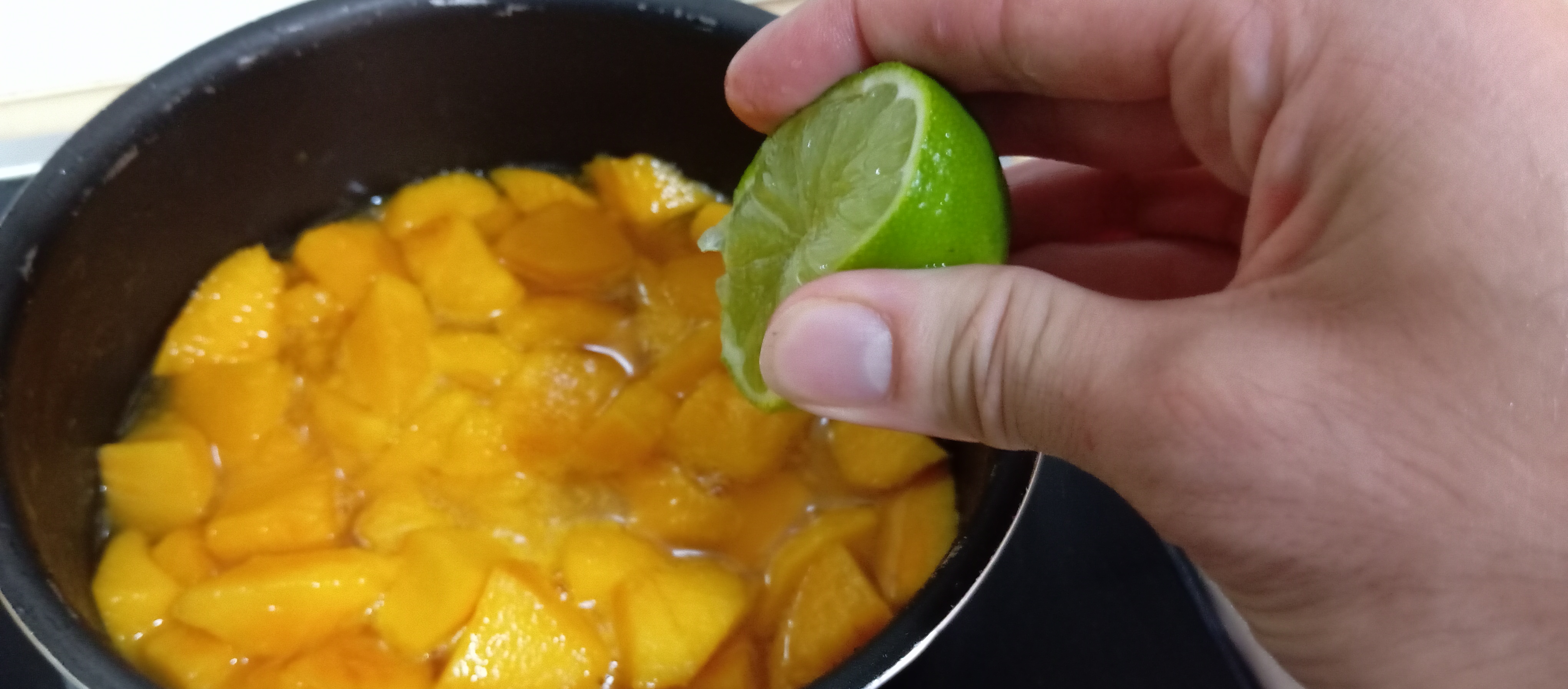 A continuación, vamos a pelar y a trocear los melocotones en cuadrados medianos para acto seguido añadirlos al almíbar. Volvemos a poner el cazo al fuego y vamos a añadir el zumo de media lima a los melocotones para evitar que se nos oxiden y el almíbar se empanice. Los dejamos cocer durante un minuto a fuego medio y retiramos del fuego para que se atemperen.