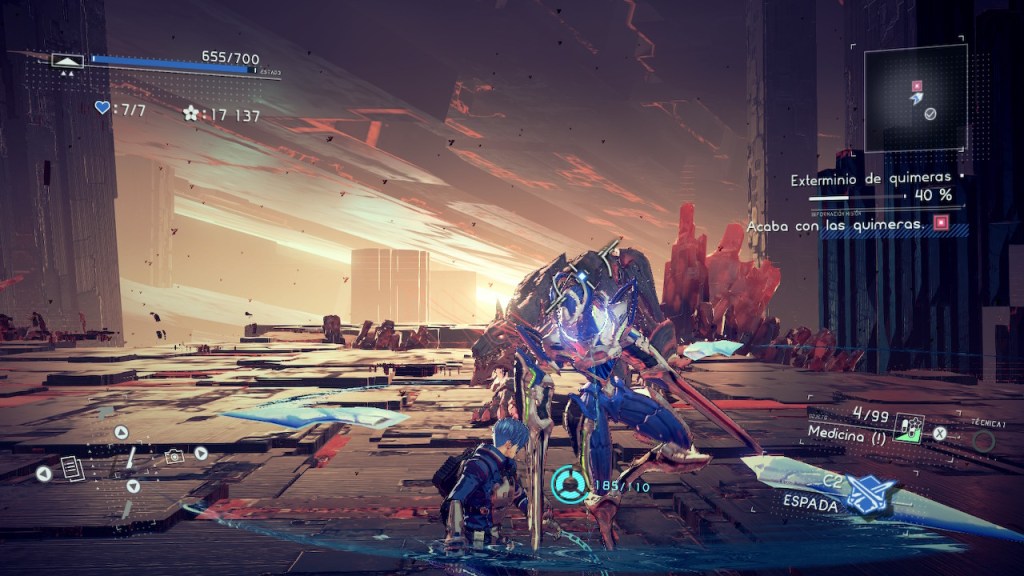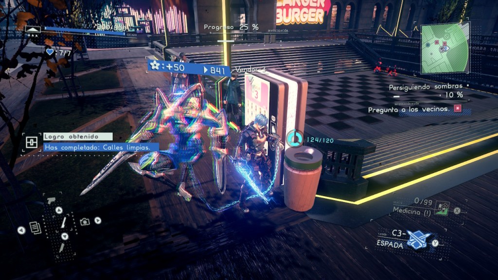 Apartándonos ya un poco en lo que a la jugabilidad se refiere vamos a centrarnos en el nivel visual que nos ofrece este título puesto que va a ser una verdadera fiesta para nuestros ojos, pudiendo definir a este como si a un anime futurista al uso le hubiésemos añadido una paleta de colores neón brillante. El estilo artístico tiene ese toque marca de la casa de PlatinumGames, con personajes bastante estilizados en su aspecto físico, ciudades futuristas llenas de detalles, los retorcidos y oscuros paisajes del plano astral y todas y cada una de las quimeras que ocuparan la totalidad de la pantalla una vez aparezcan para ponernos las cosas difíciles. La estética ciberpunk está perfectamente realizada, con un contraste entre lo moderno y lo decadente. Además, las animaciones de combate son fluidas, y ver a cualquiera de nuestras Legión desatar caos y destrucción mientras hacemos piruetas acrobáticas repartiendo tollinas es simplemente impresionante. Como ya sabemos, el hardware de la Switch no destaca por ser un portento moviendo algunos títulos, por lo que con este título va a utilizar sutiles trucos visuales para mantener un rendimiento estable, sin sacrificar demasiado en calidad gráfica.