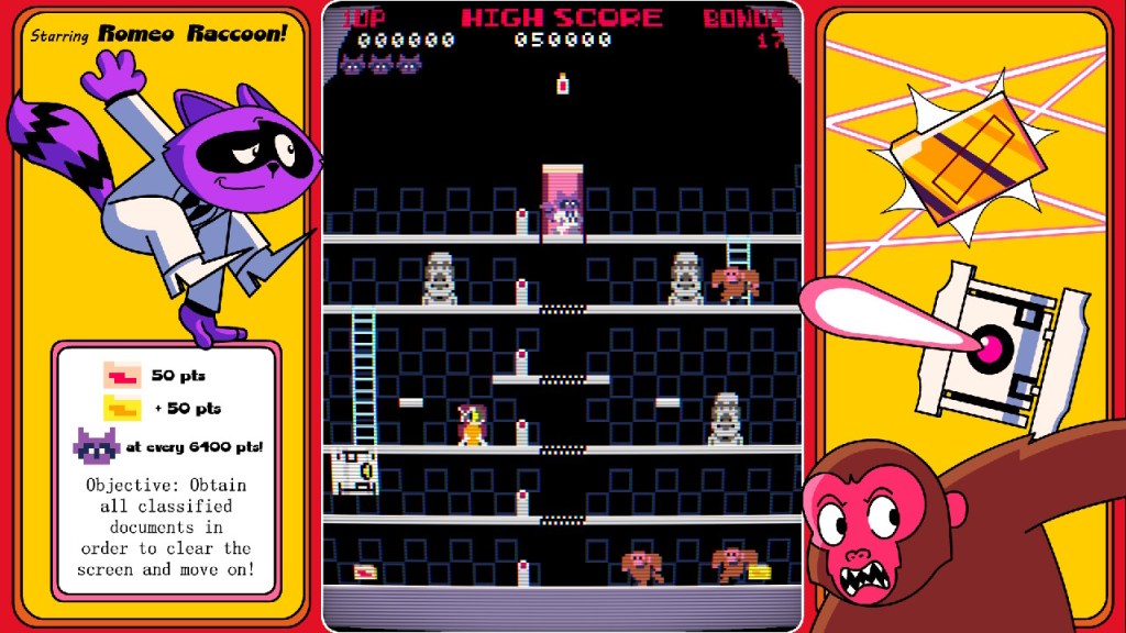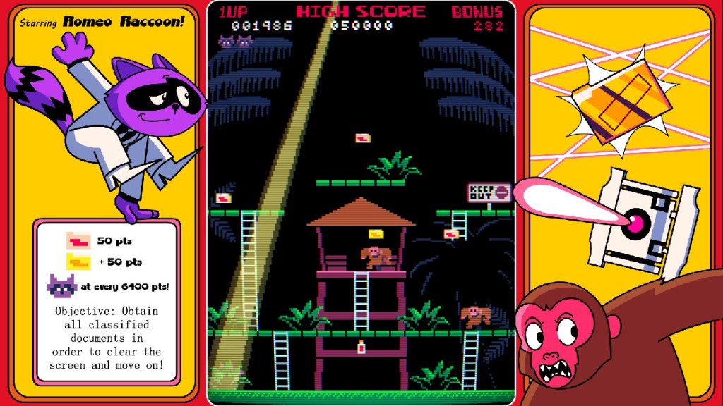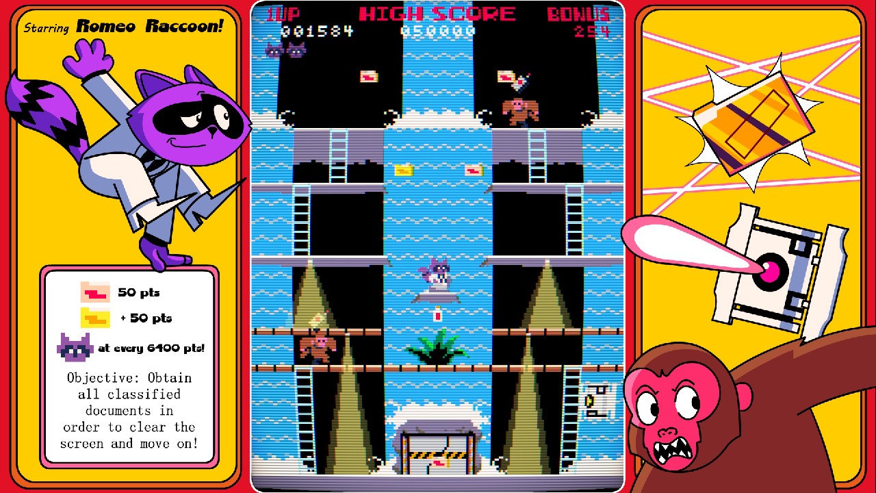 Y eso es justo lo que el equipo de Slain Mascot ha conseguido tras desarrollar y traer a nuestra biblioteca de juegos allá por el año 2023 para PC y saliendo ahora el día 19 de diciembre de este mismo año para la tienda virtual de la consola de Nintendo un título que conoceremos como «Super Spy Raccoon´´. Su premisa pues de primeras es muy sencilla ya que desde el primer minuto y tras pulsar el botón start para comenzar nuestra primera partida nos vamos a poner en la piel peluda de Romeo Raccoon, un simpaticón mapache que ejercerá de espía como profesión y al que debemos ayudar para recoger todos los documentos secretos esparcidos por todos y cada uno de los 5 niveles que conforman el juego ¡Cosa que no será coser y cantar pues bajo ningún concepto los enemigos deberán vernos!