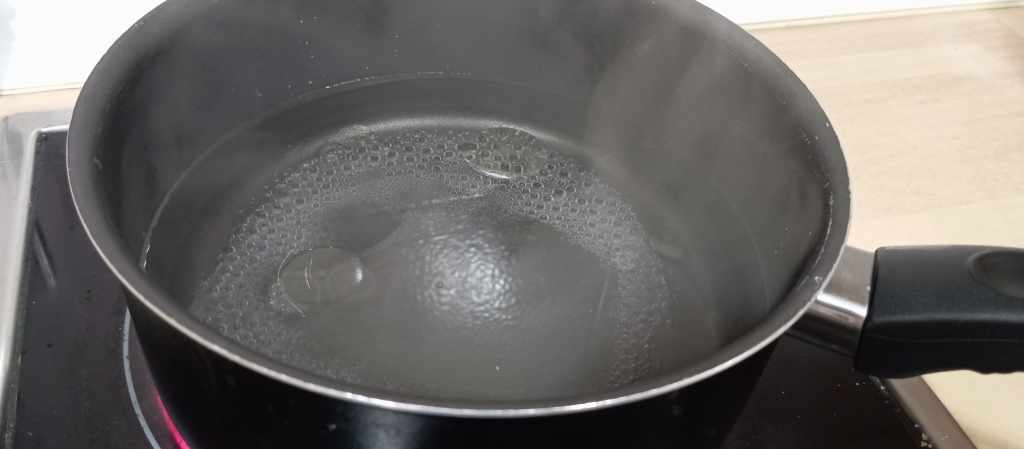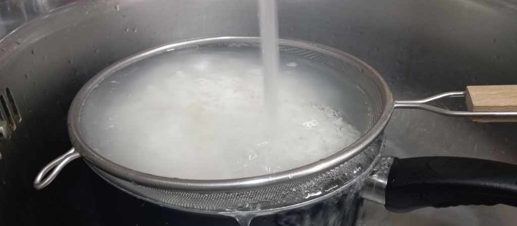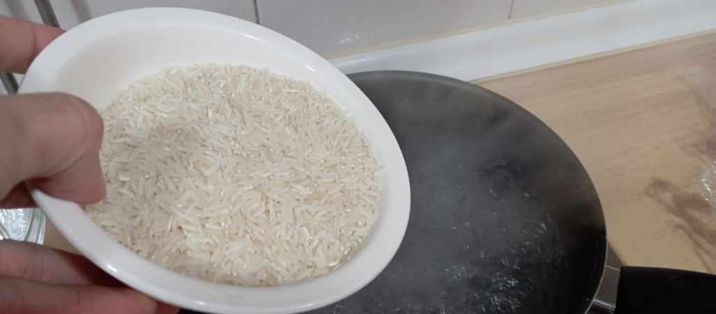 Cuando ya tengamos formadas las brochetas de carne las dejamos reposar a temperatura ambiente como bien hemos dicho anteriormente y ahora vamos a ir cociendo el arroz basmati en un cazo con agua hirviendo, una pizca de sal y un poquito de aceite de oliva. Introducimos el arroz en el agua cuando esté hirviendo bien, momento en el que bajaremos el fuego y dejaremos cocer durante 16 minutos, removiendo de vez en cuando (la cantidad de agua es de 1,5 por una de arroz). Una vez cocido lo pasaremos por agua fría y reservamos.