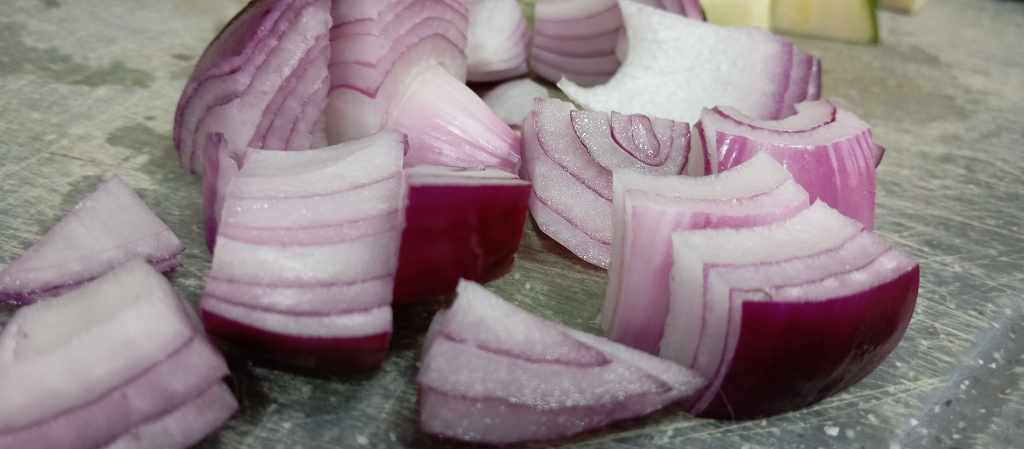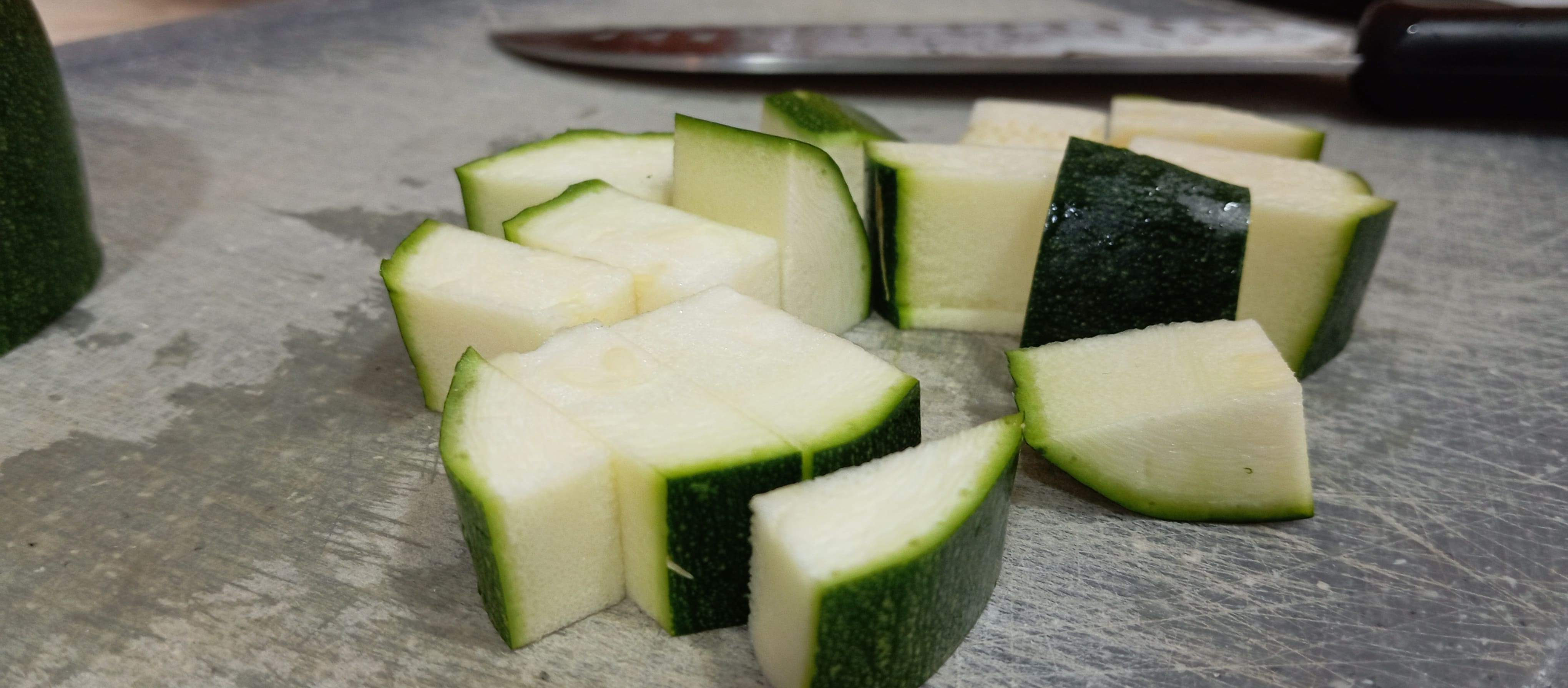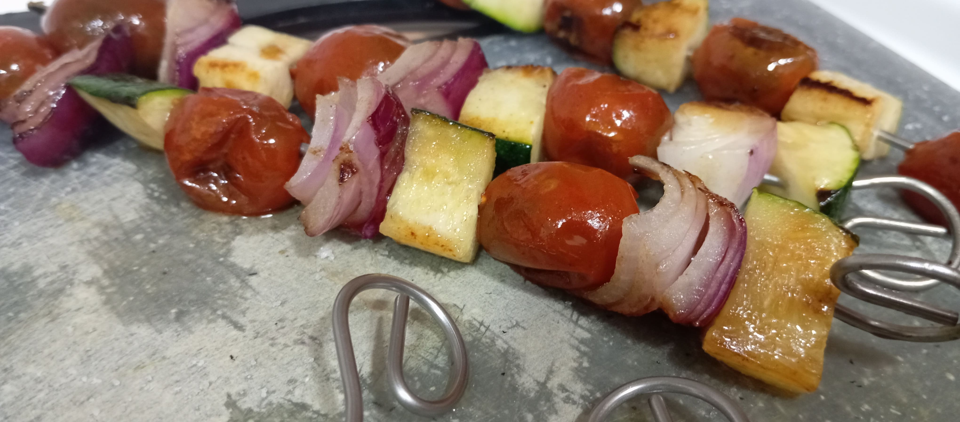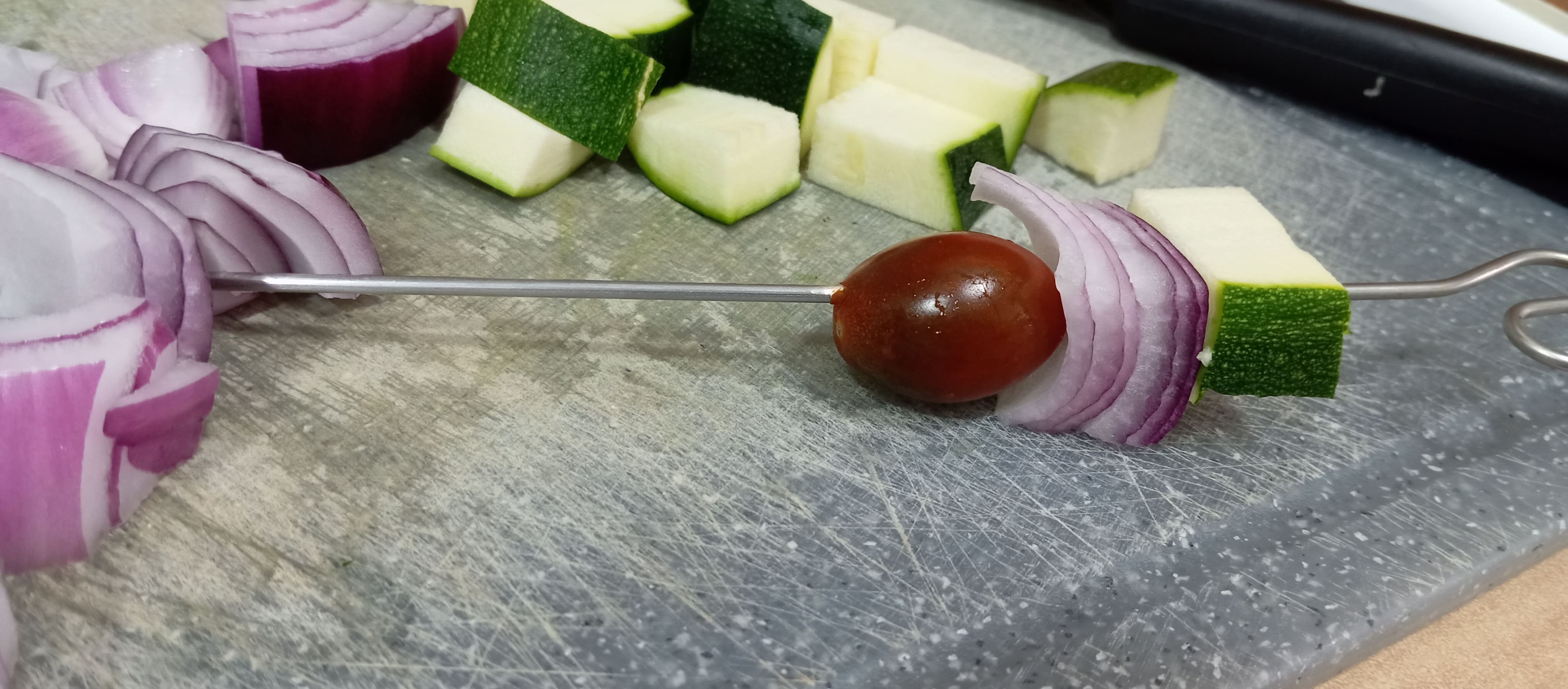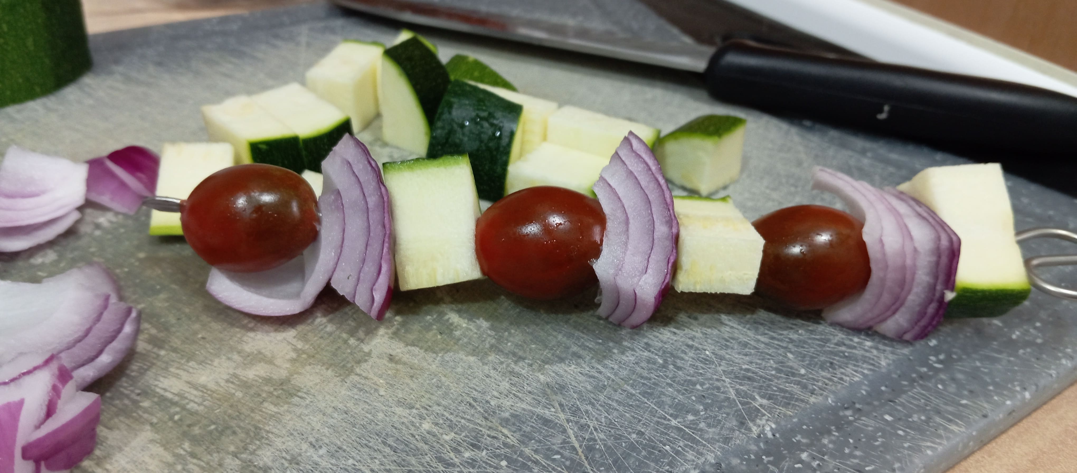 Seguimos montando más brochetas, pero esta vez las vamos a montar con las verduras que cortaremos en mirepoix (tamaños medianos) poniendo primero un trozo de calabacín, uno de cebolla morada, un cherry y así hasta completar el palo de la brocheta.