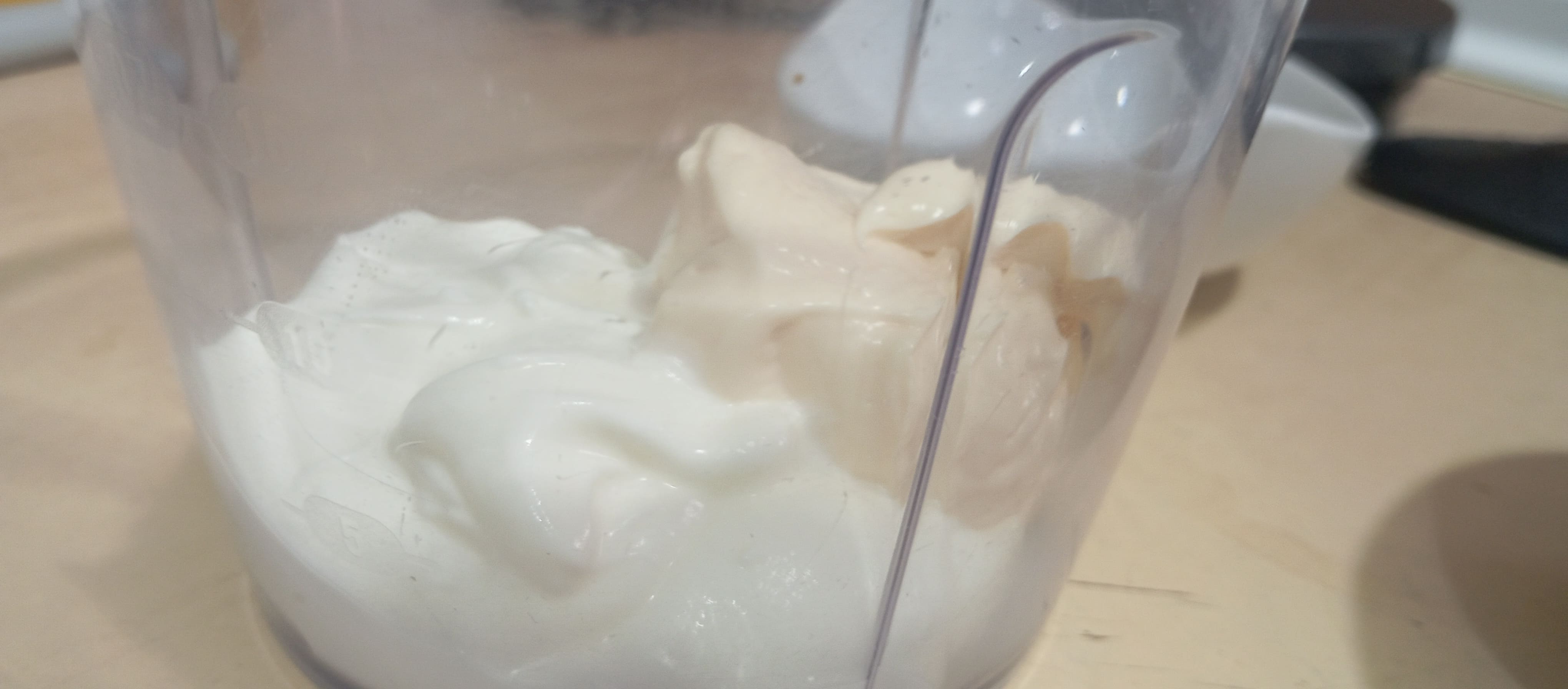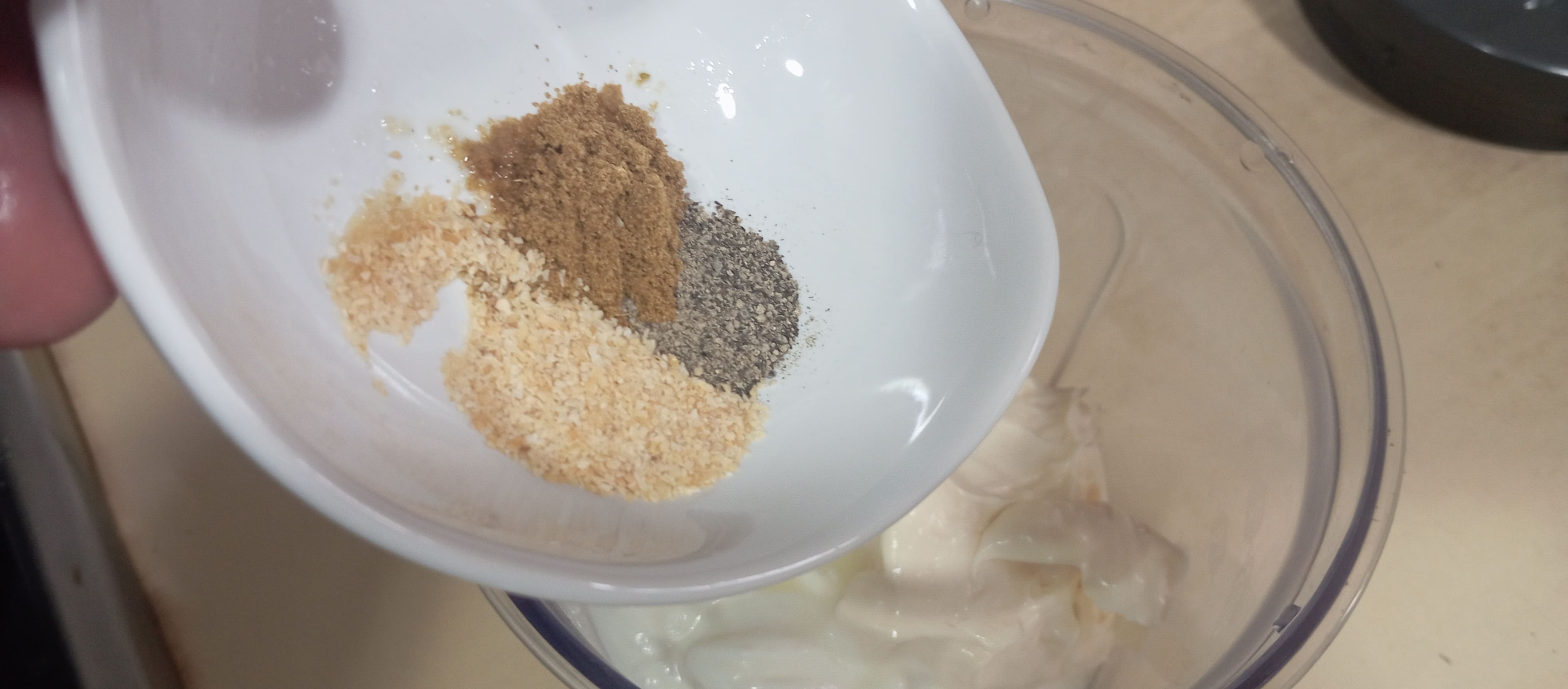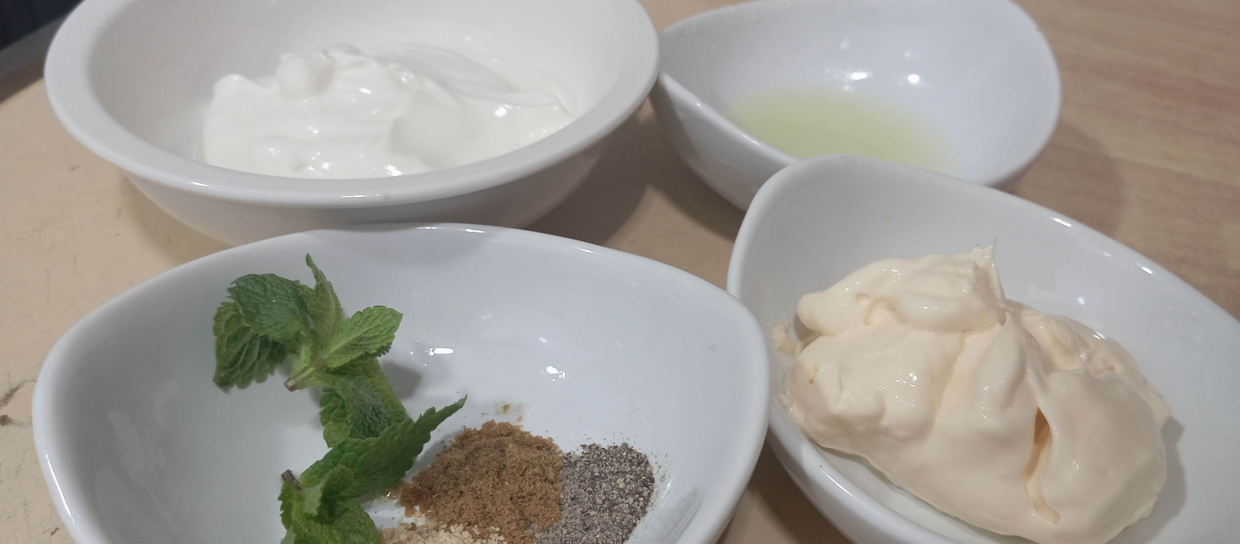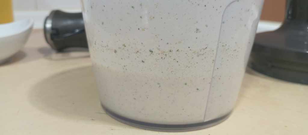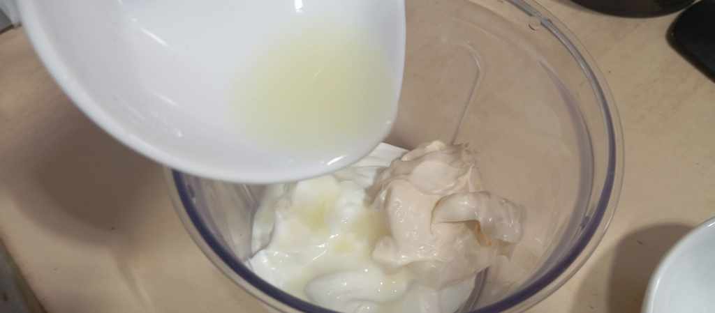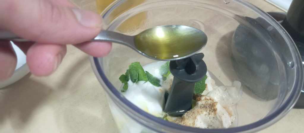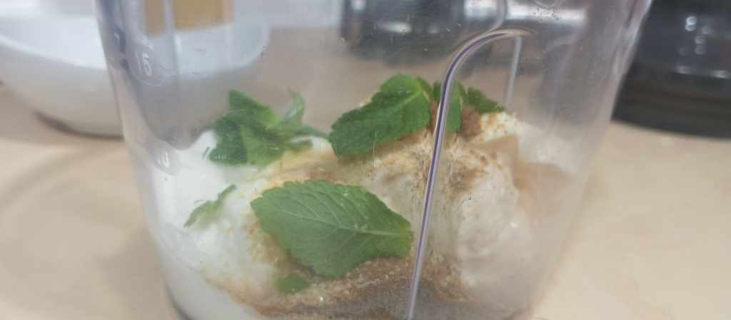 Para elaborar esta solo vamos a tener que poner en un vaso el yogurt griego, el zumo de media lima, el comino, el ajo en polvo, la hierbabuena/menta, la pimienta, la sal y el aceite de oliva para triturarlo bien todo.