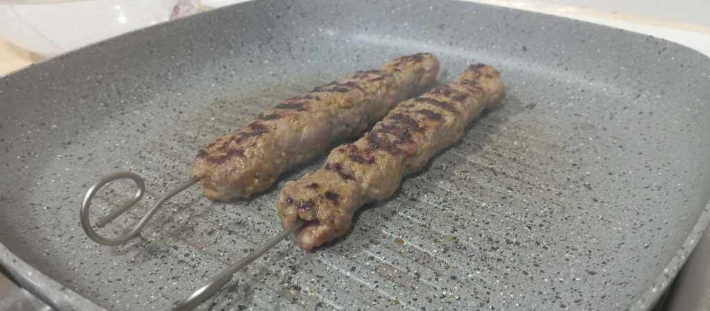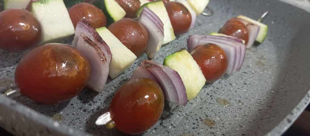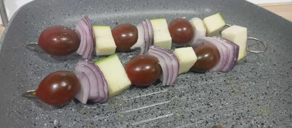 Formadas ya estas vamos a ir calentando la parrilla a fuego fuerte con un poquito de aceite de oliva e introducimos las brochetas previamente aderezadas con un poco de sal y dejándolas cocinarse a fuego medio durante unos 10 minutos (5 por cada lado).