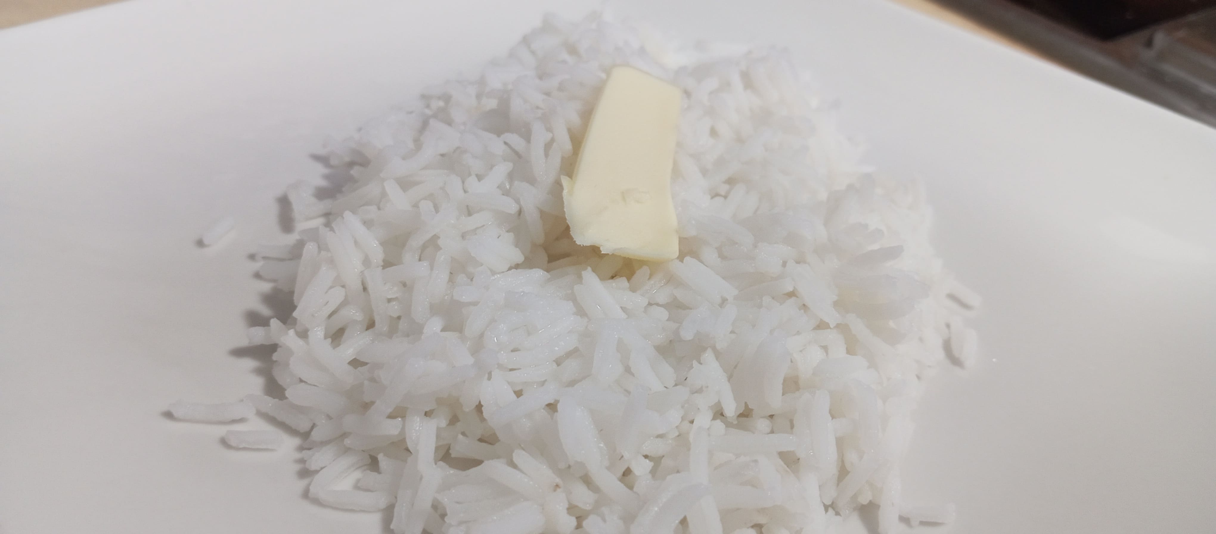 Ya solo nos queda ir montando el plato en lo que la carne se termina de hacer. Para ello vamos a poner un trozo de mantequilla encima del arroz y le daremos un golpe de calor al micro, removiendo bien después para que se integre en su totalidad.