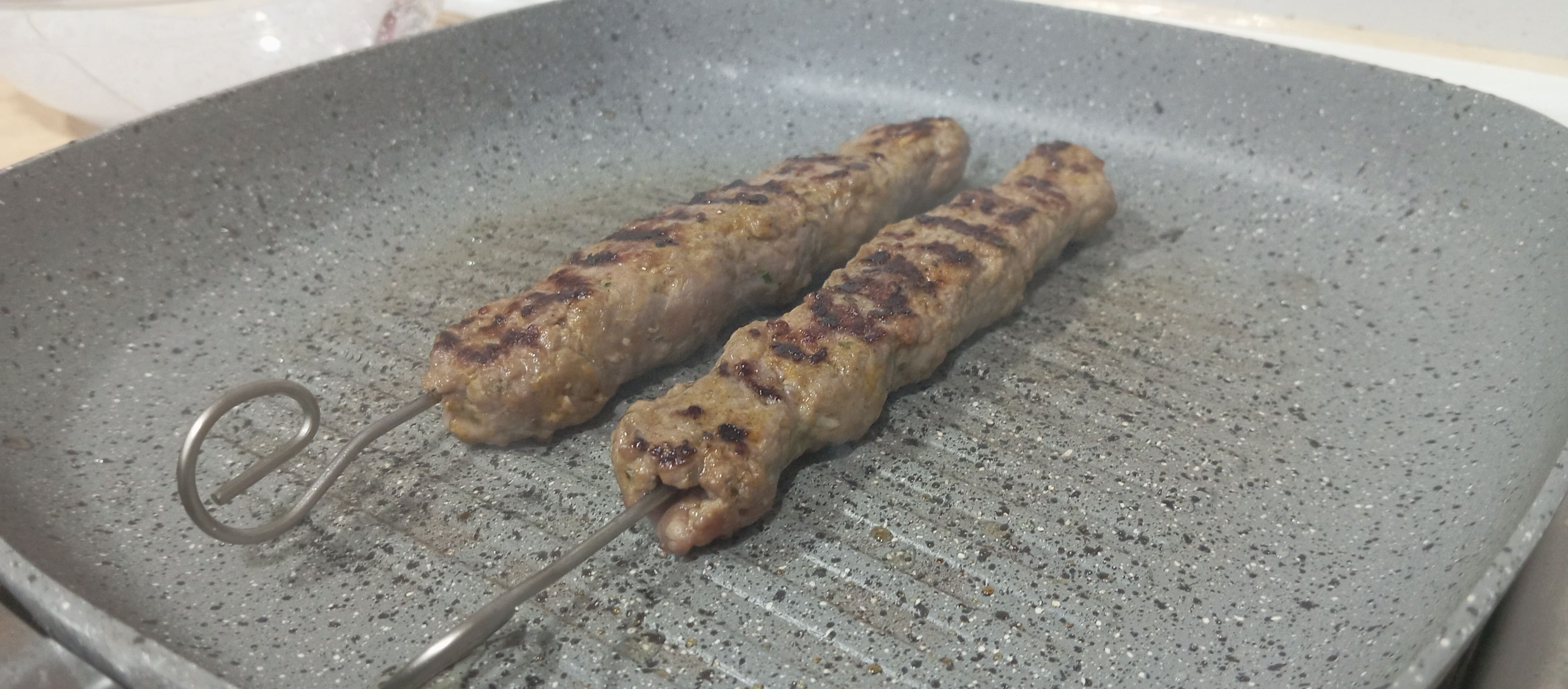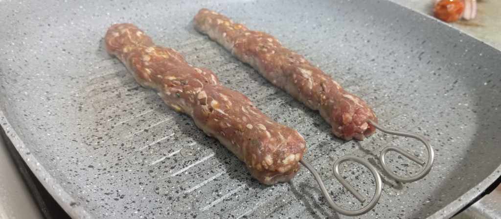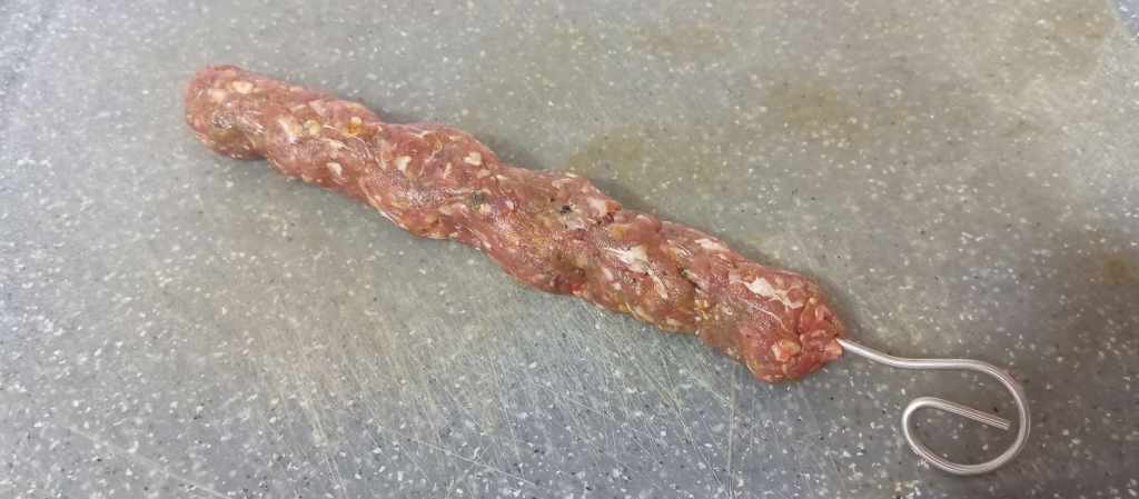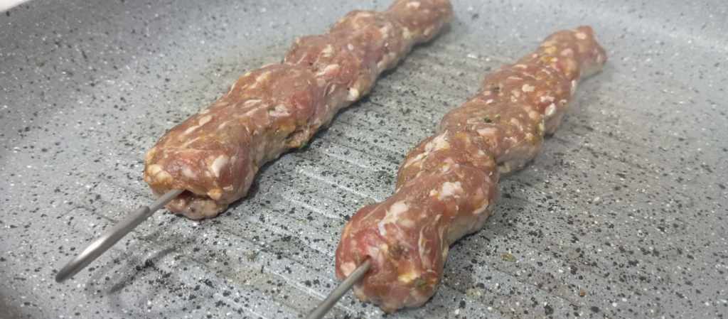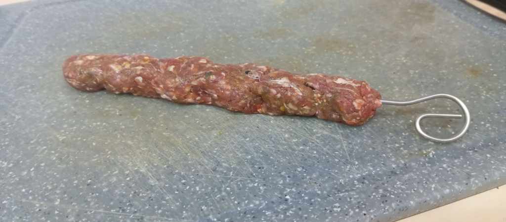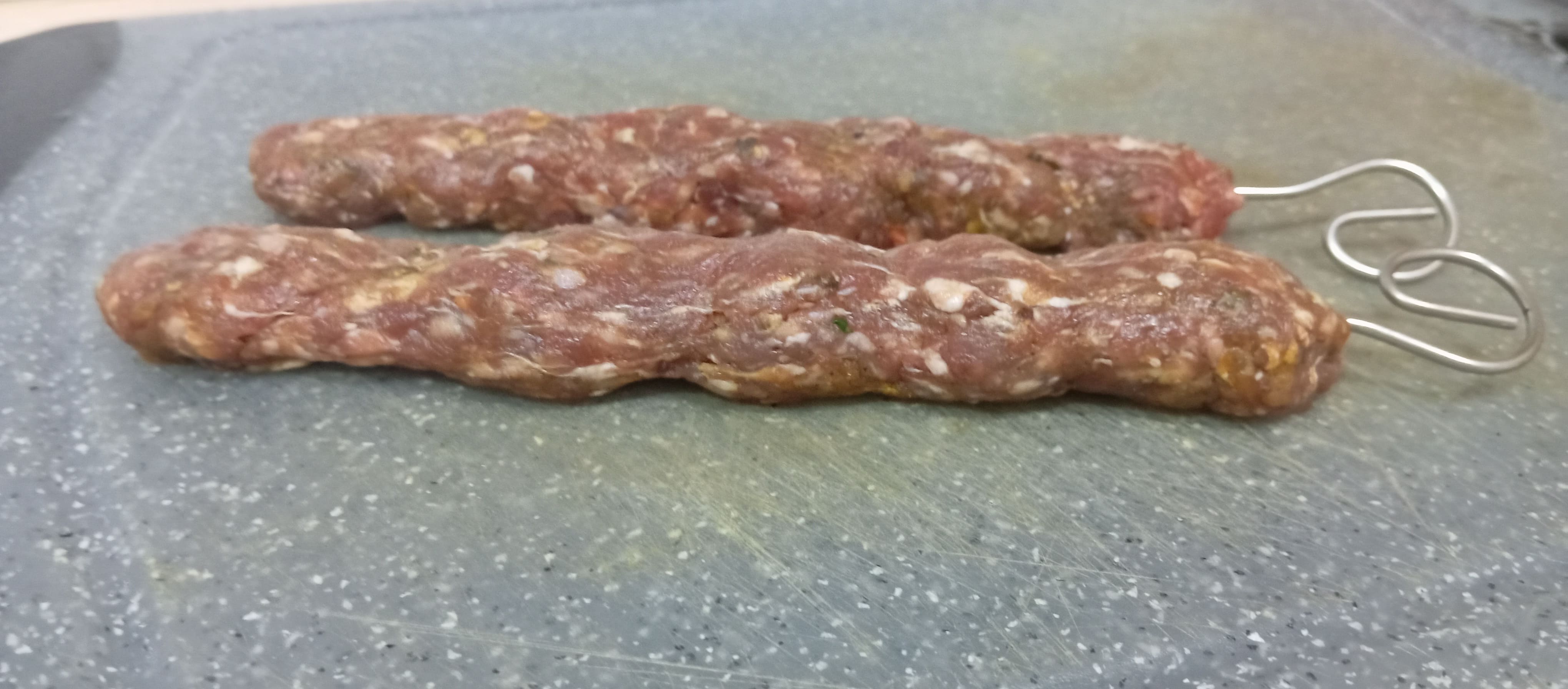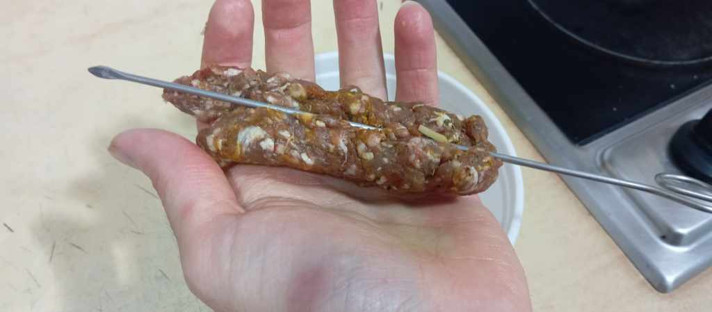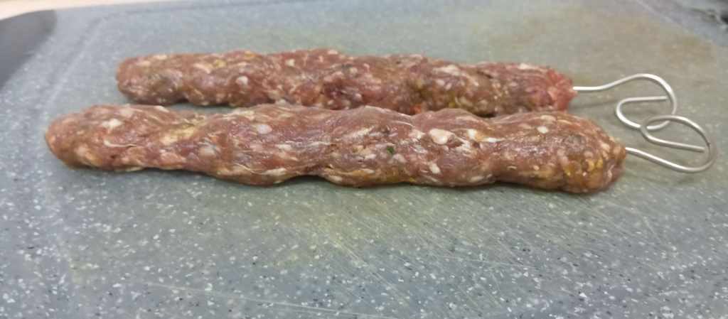 Una vez pasado el tiempo vamos a sacar la carne de la nevera para ir formando las brochetas y que estas vayan tomando forma para que a la hora de pasarlas por la parrilla no se nos desmoronen. Para ello vamos a tomar un trozo de la carne en la que colocaremos encima un palo de brocheta, bien de madera o metal, envolviendo esta con la propia carne y cubriéndola en su totalidad hasta llegar casi al final de esta. Aplastamos bien y la damos forma de pliegues en los laterales dándole un pellizco a la carne con la yema de los dedos mojadas en un poquito de agua.