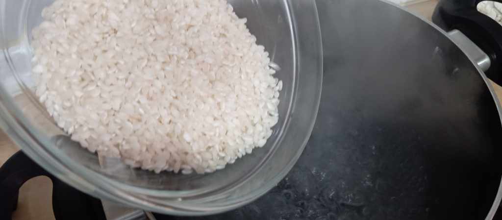 Lo primero que vamos a hacer será añadir en un cazo añadimos el agua poniendo a fuego medio y dejando que llegue a ebullición. Una vez que rompa a hervir añadiremos el arroz y coceremos durante 5 minutos viendo como absorbe toda el agua.