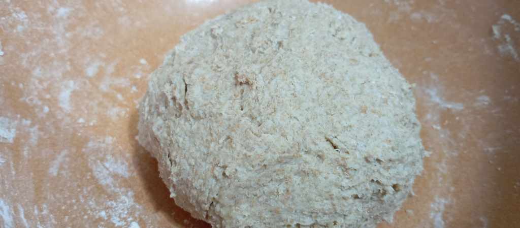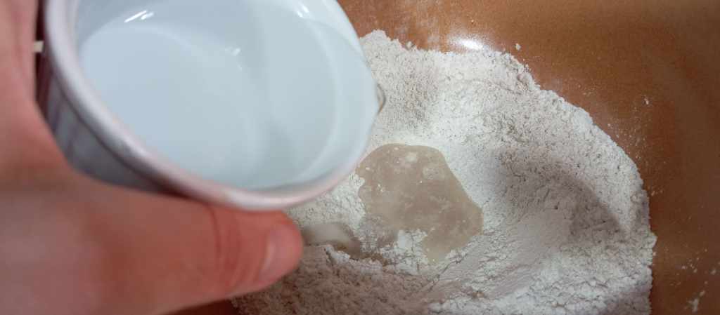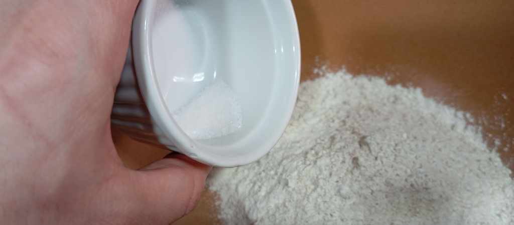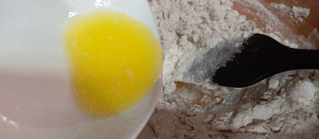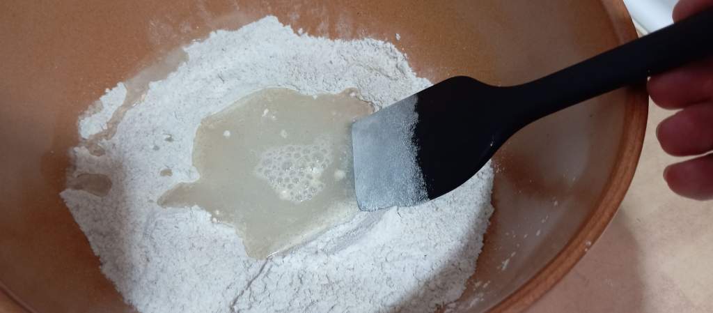 Mientras tanto vamos a ir preparando la masa. Para ello vamos en un bol vamos a incorporar la harina de centeno junto la harina de espelta, la sal, el agua y la mantequilla derretida. Mezclamos ahora con la ayuda de una espátula de silicona hasta formar una mezcla más o menos compacta.