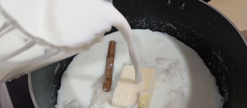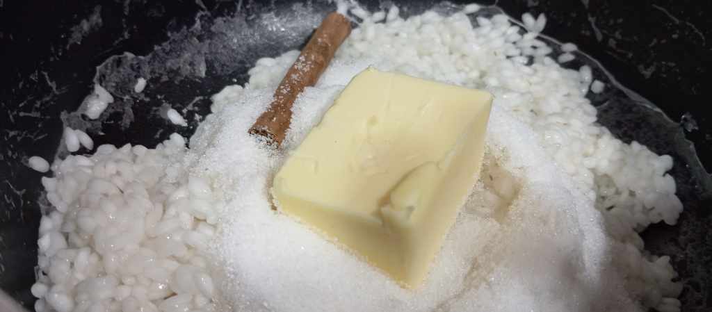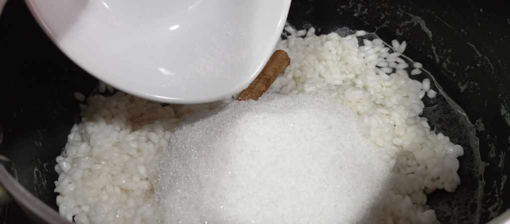 Añadimos ahora la rama de canela, el azúcar, la mantequilla previamente empomada y la leche, bajando el fuego y dejando cocer durante unos 45 minutos aproximadamente dando vueltas de vez en cuando para que no se nos pegue. Cuando pase el tiempo el arroz deber tener una textura suave y espesa.