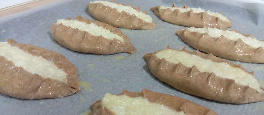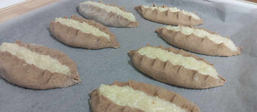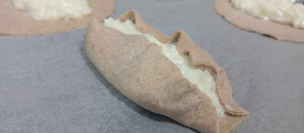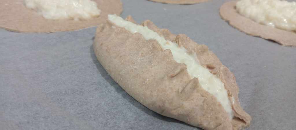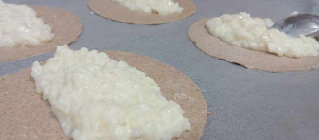 Mientras vamos a ir precalentando el horno a 180ºC con calor arriba y abajo y preparando una bandeja con papel para hornear donde iremos colocando las piezas de masa que iremos rellenando con una buena cucharada de la mezcla del arroz dejando un poco de espacio alrededor del borde de las piezas.