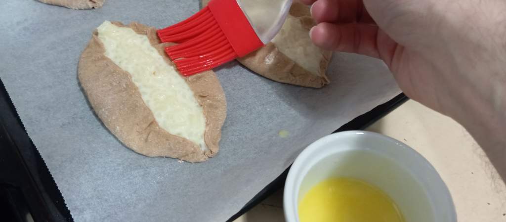 Para dar forma al pastel vamos a ir plegando la masa sobre el relleno y comenzaremos a crear ondas desde la mitad hacia los extremos ayudándonos con los dedos. Pintamos los pasteles con la otra parte de la mantequilla fundida.