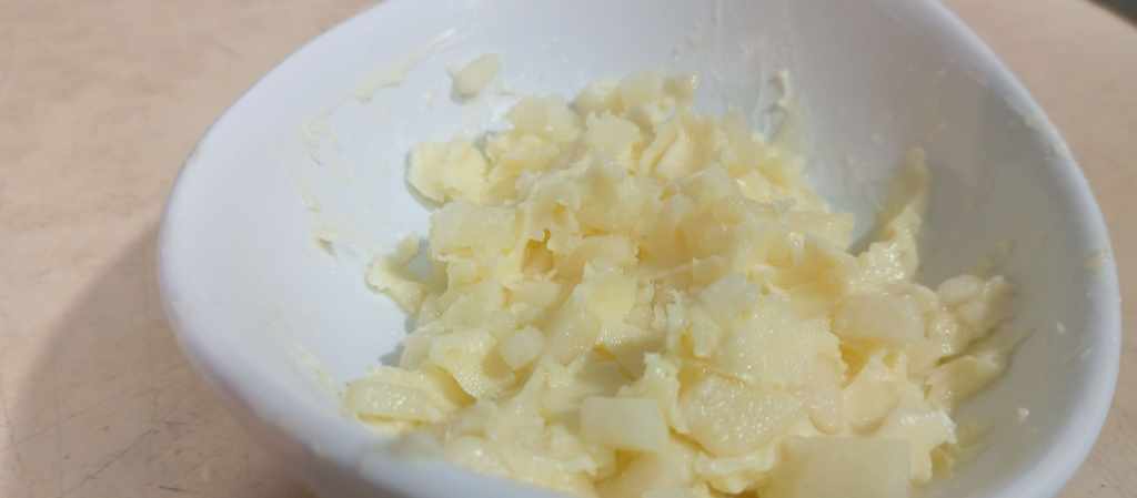 Para ello solo tenemos que cocer los huevos en agua hirviendo con una pizca de sal y un chorrito de vinagre para que se pelen bien cuando estén fríos. Una vez pelados vamos a picarlos finamente y lo mezclamos con la mantequilla, salpimentado y colocando encima de las piezas.