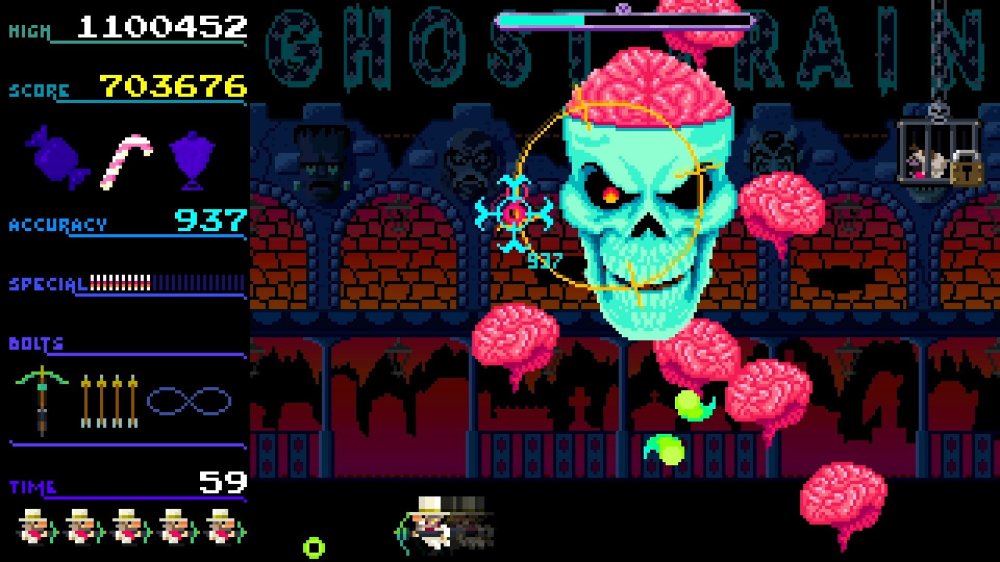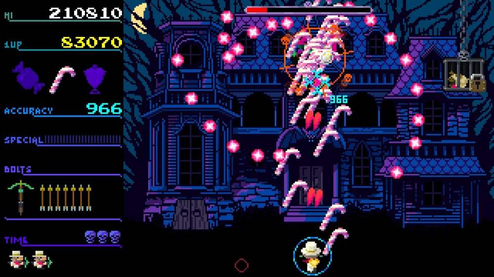 El sistema de juego se inspira en los clásicos de disparos de los noventa, con un estilo “gallery shooter” que mezcla reflejos, precisión y ritmo frenético. Los 12 niveles del juego están repletos de cementerios envueltos en niebla, trenes fantasmas que parecen salidos de un sueño febril y mansiones donde cada cuadro parece observarte. La mecánica es directa: moverse, disparar, esquivar y mejorar tus armas con las monedas que vas consiguiendo. Pero entre tanto caos hay detalles encantadores, como poder invocar a tu perro para atacar enemigos o recoger bonus. Es de esos juegos que no necesitas entender: simplemente lo sientes.