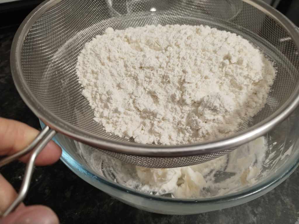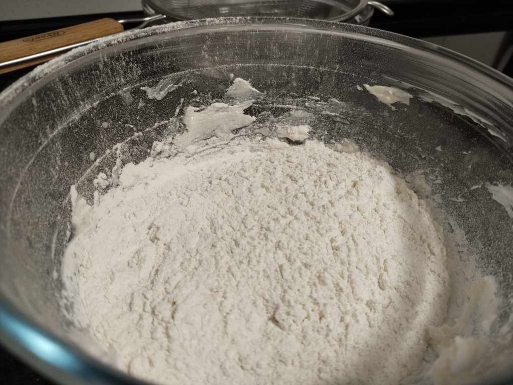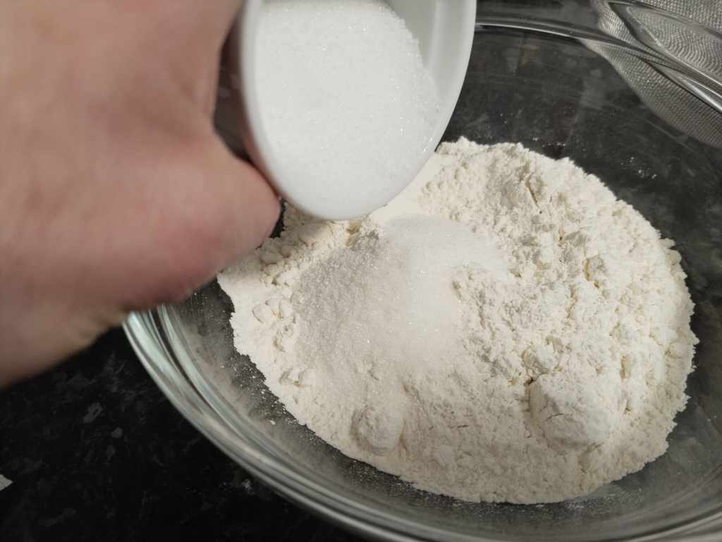 Ahora vamos a añadir la harina tamizada junto con el azúcar y la sal. Igualmente, la añadiremos en dos o tres tandas hasta que obtengamos una masa suave y homogénea.