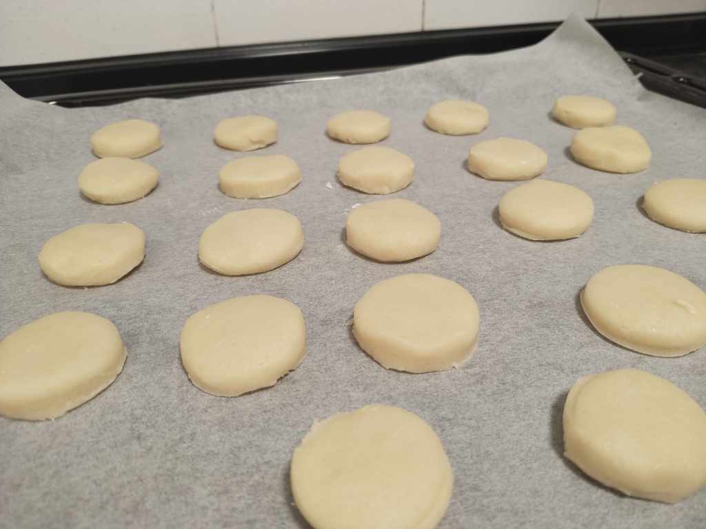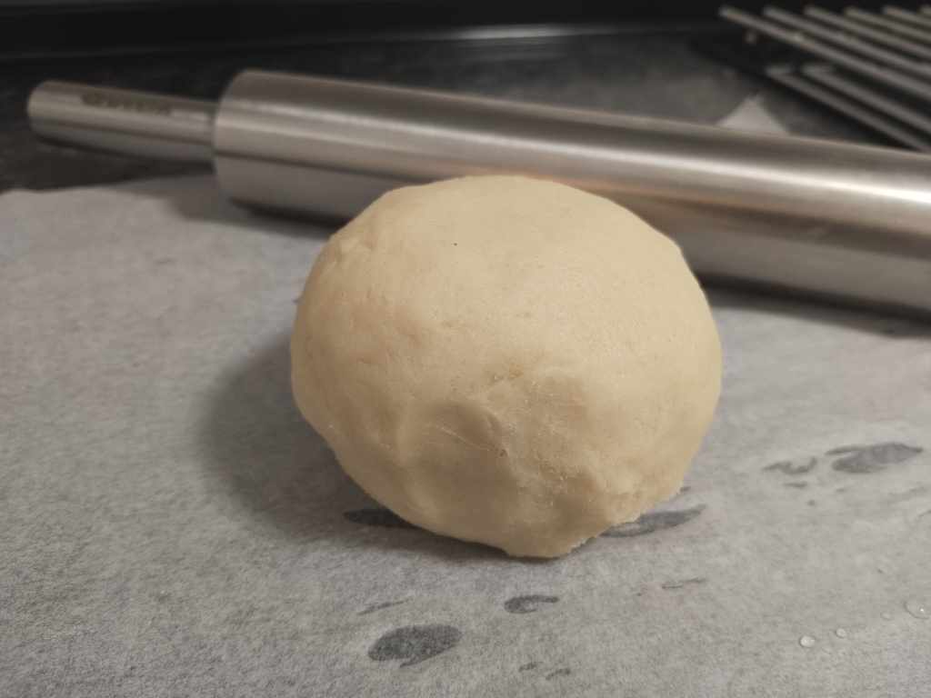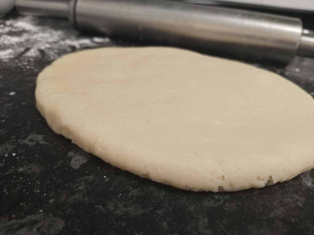 La sacamos de la nevera y la vamos a estirar en la encimera (previamente espolvoreada con un poquito de harina para evitar que se nos pegue) con la ayuda de un rodillo, con un tamaño aproximado de 1 cm de grosor. Una vez estirada vamos a cortar piezas con la ayuda de un molde no muy grande que puede ser redondo o cuadrado. Eso ya a vuestro gusto o por lo que más a mano tengáis en casa.