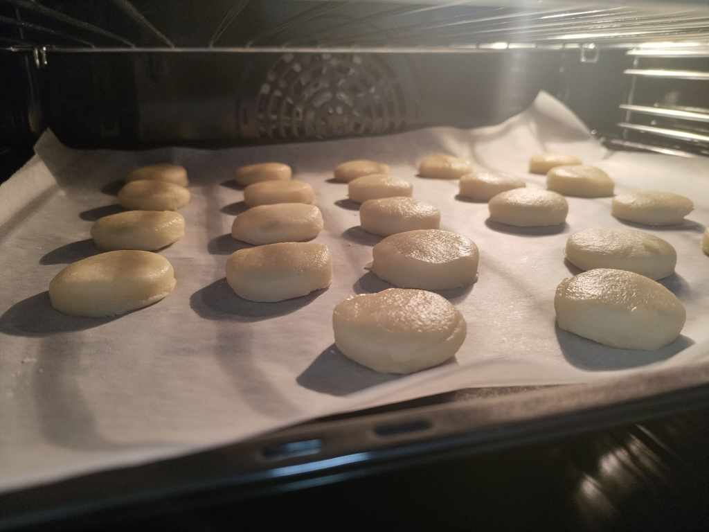 Los vamos a colocar con cuidado en una bandeja con papel de horno y los vamos a hornear a 180 °C (calor arriba y abajo) durante 20 minutos, sin que se doren demasiado. Vamos a ver que ya están hechos cuando se empieza a formar un surco tostado alrededor de la superficie.