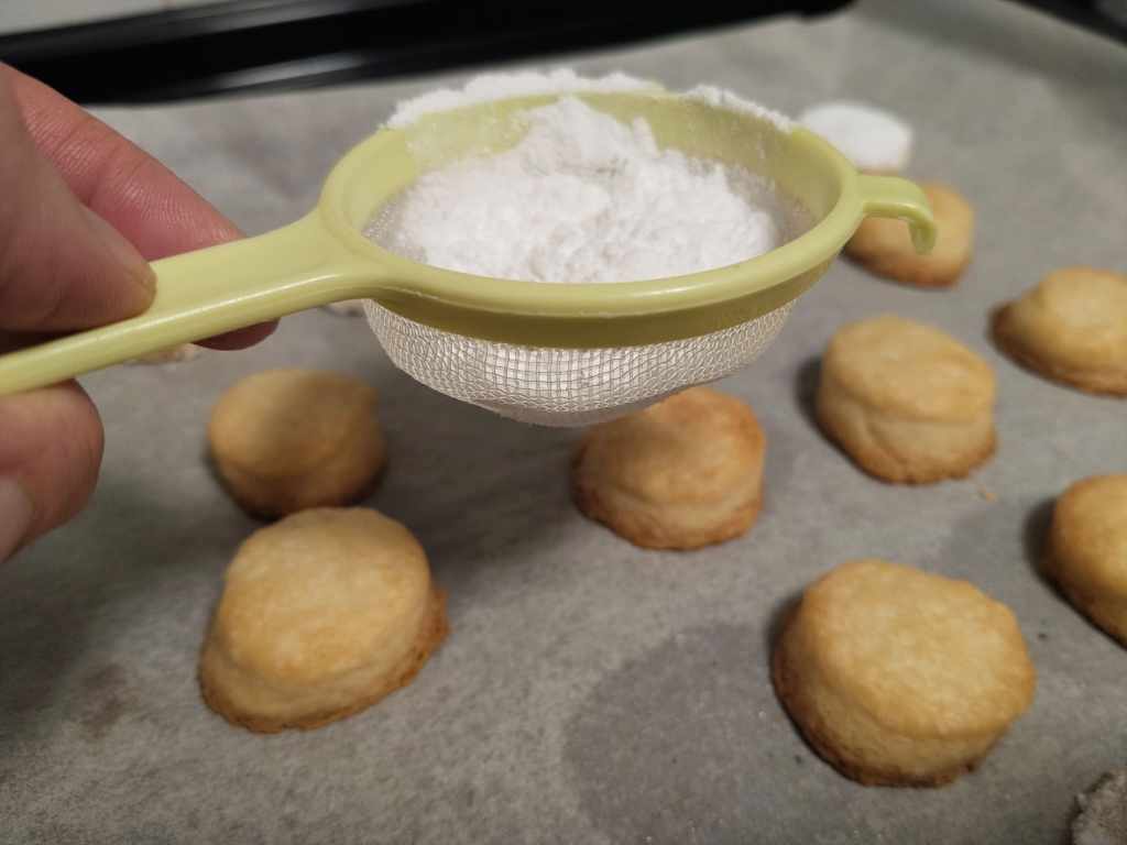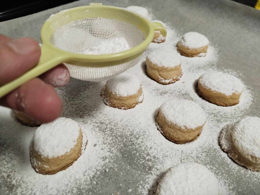 Una vez horneados los sacamos del horno y los dejamos enfriar unos minutos para después, con la ayuda de un colador, los vamos a espolvorear generosamente con el azúcar glas.