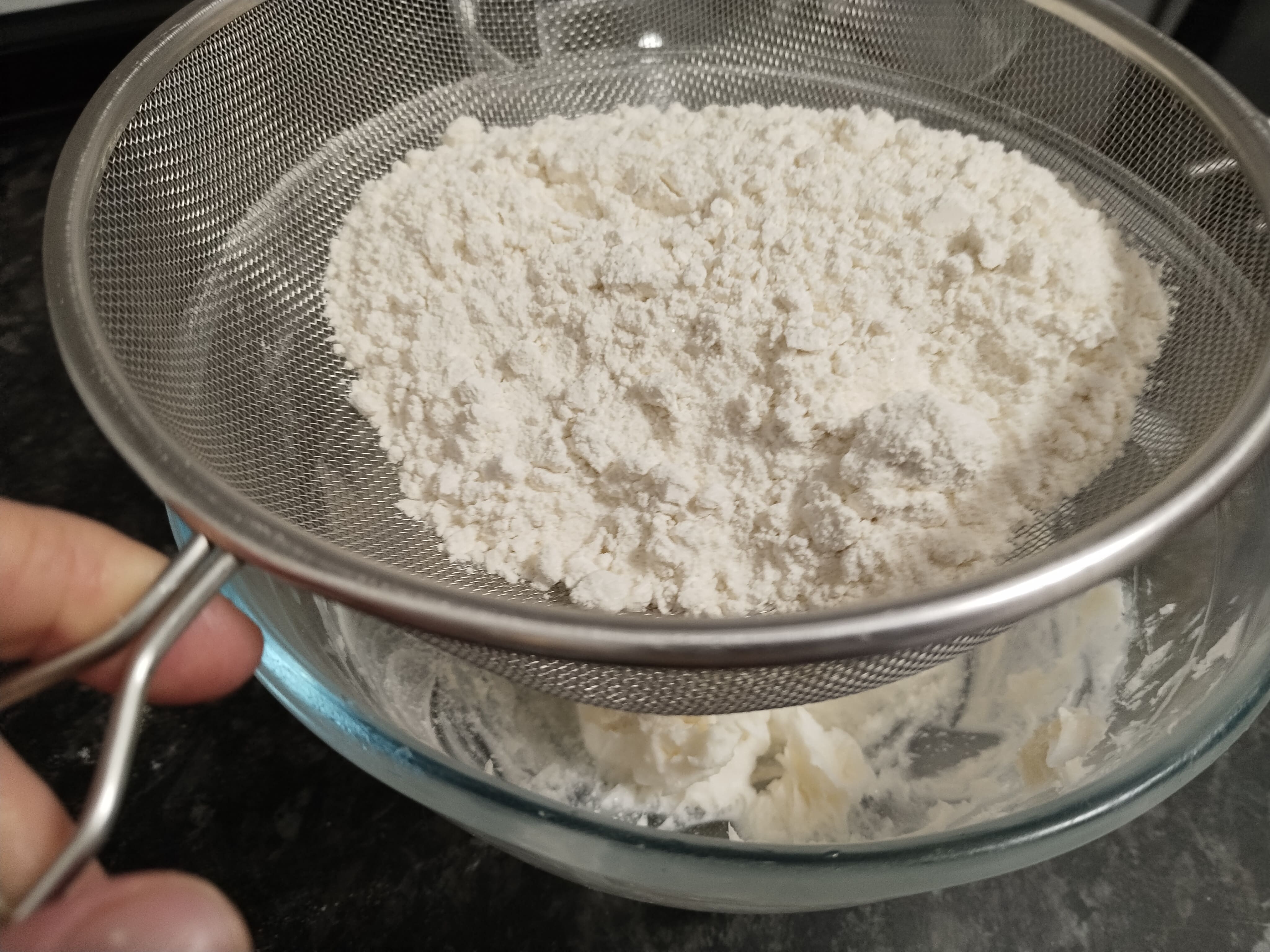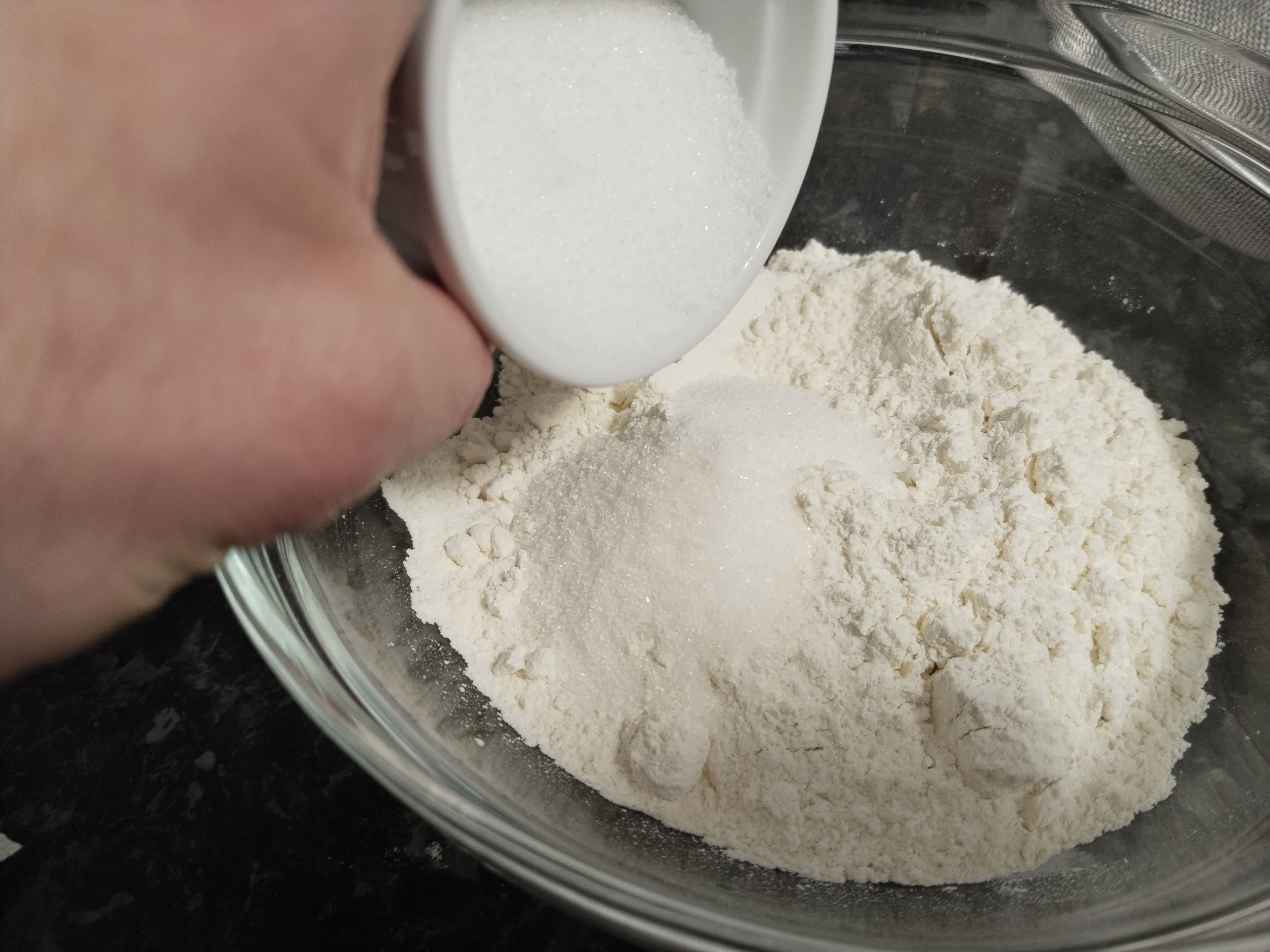 Ahora vamos a añadir la harina tamizada junto con el azúcar y la sal. Igualmente, la añadiremos en dos o tres tandas hasta que obtengamos una masa suave y homogénea.