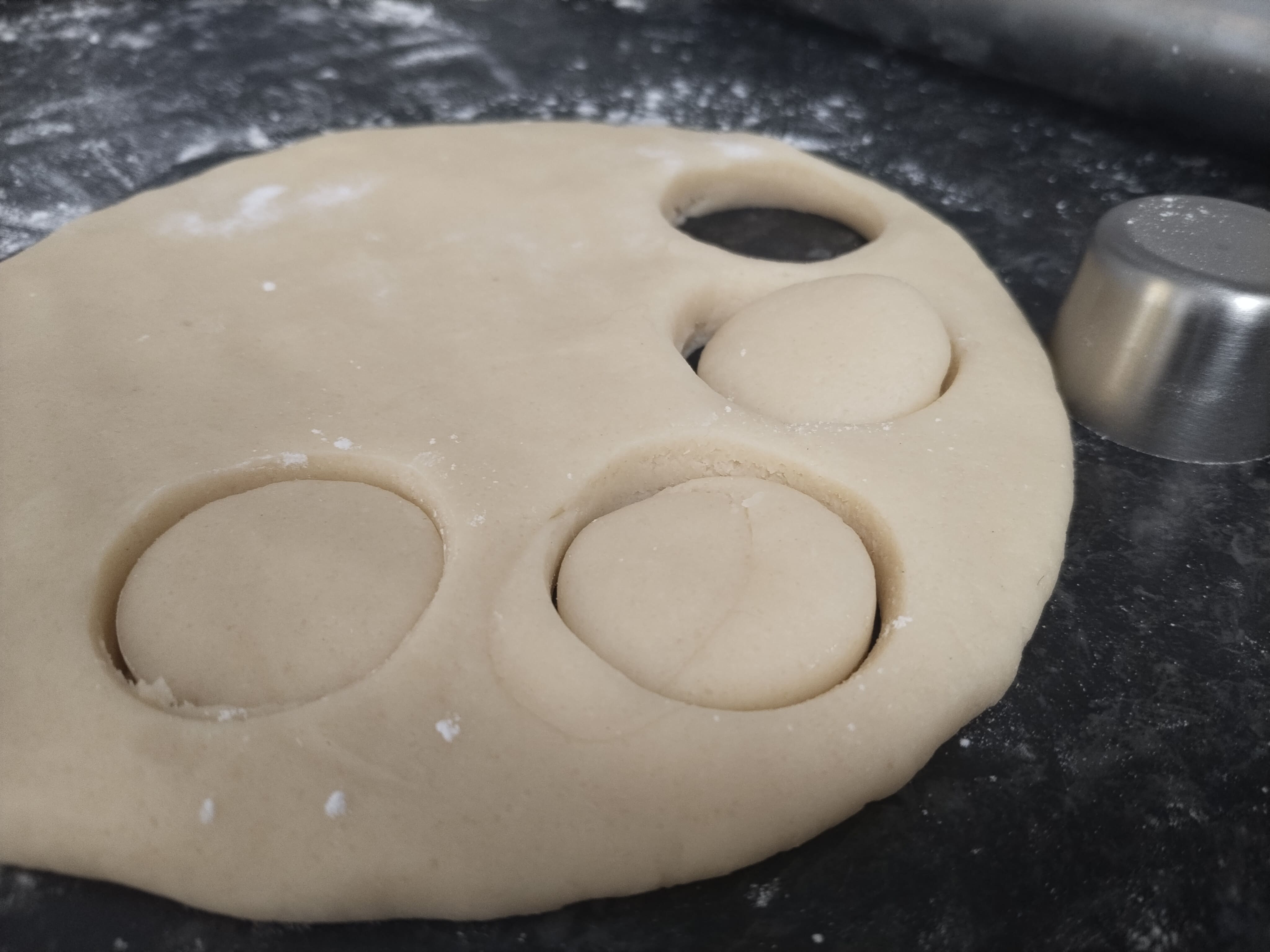 La sacamos de la nevera y la vamos a estirar en la encimera (previamente espolvoreada con un poquito de harina para evitar que se nos pegue) con la ayuda de un rodillo, con un tamaño aproximado de 1 cm de grosor. Una vez estirada vamos a cortar piezas con la ayuda de un molde no muy grande que puede ser redondo o cuadrado. Eso ya a vuestro gusto o por lo que más a mano tengáis en casa.