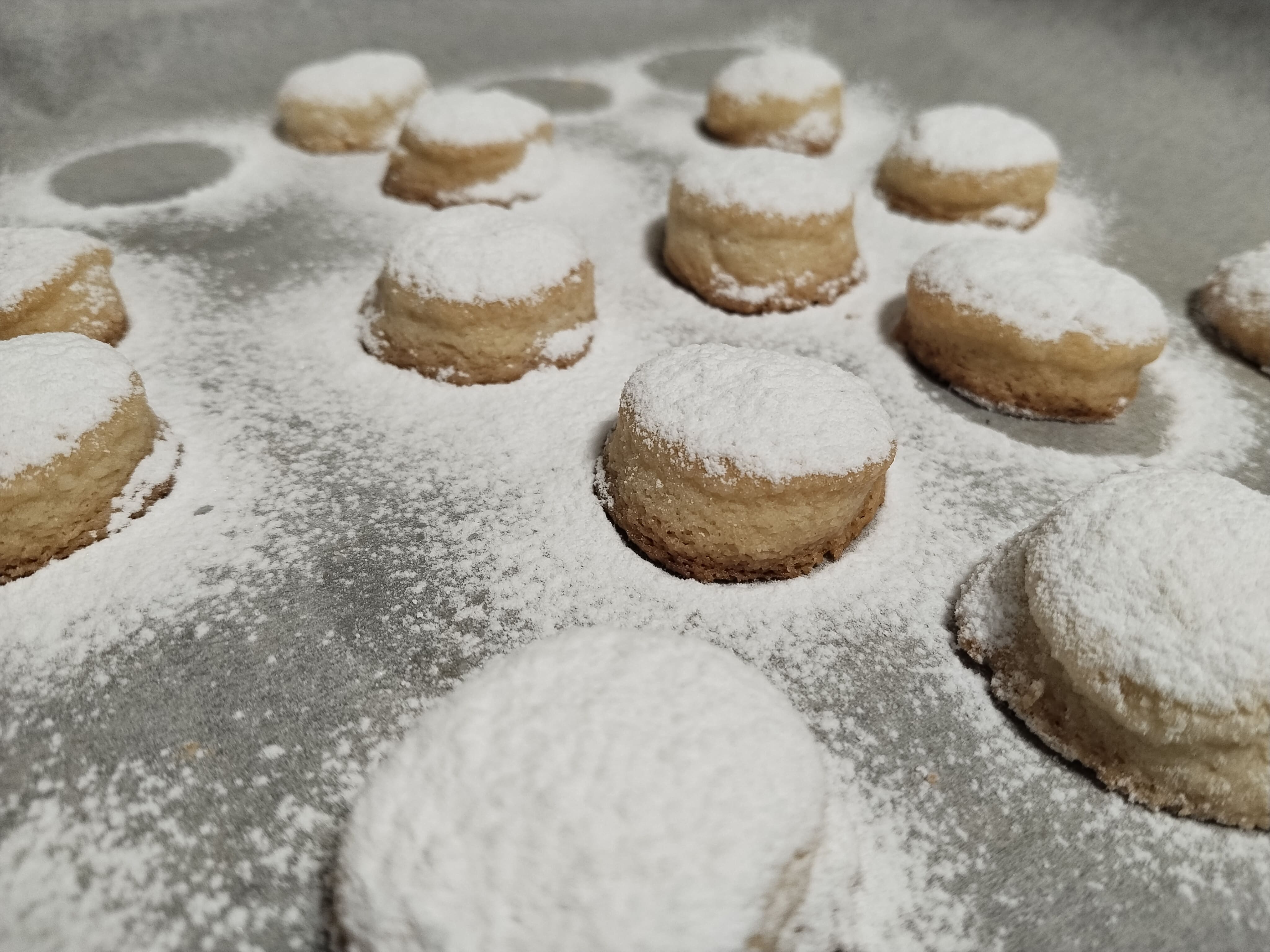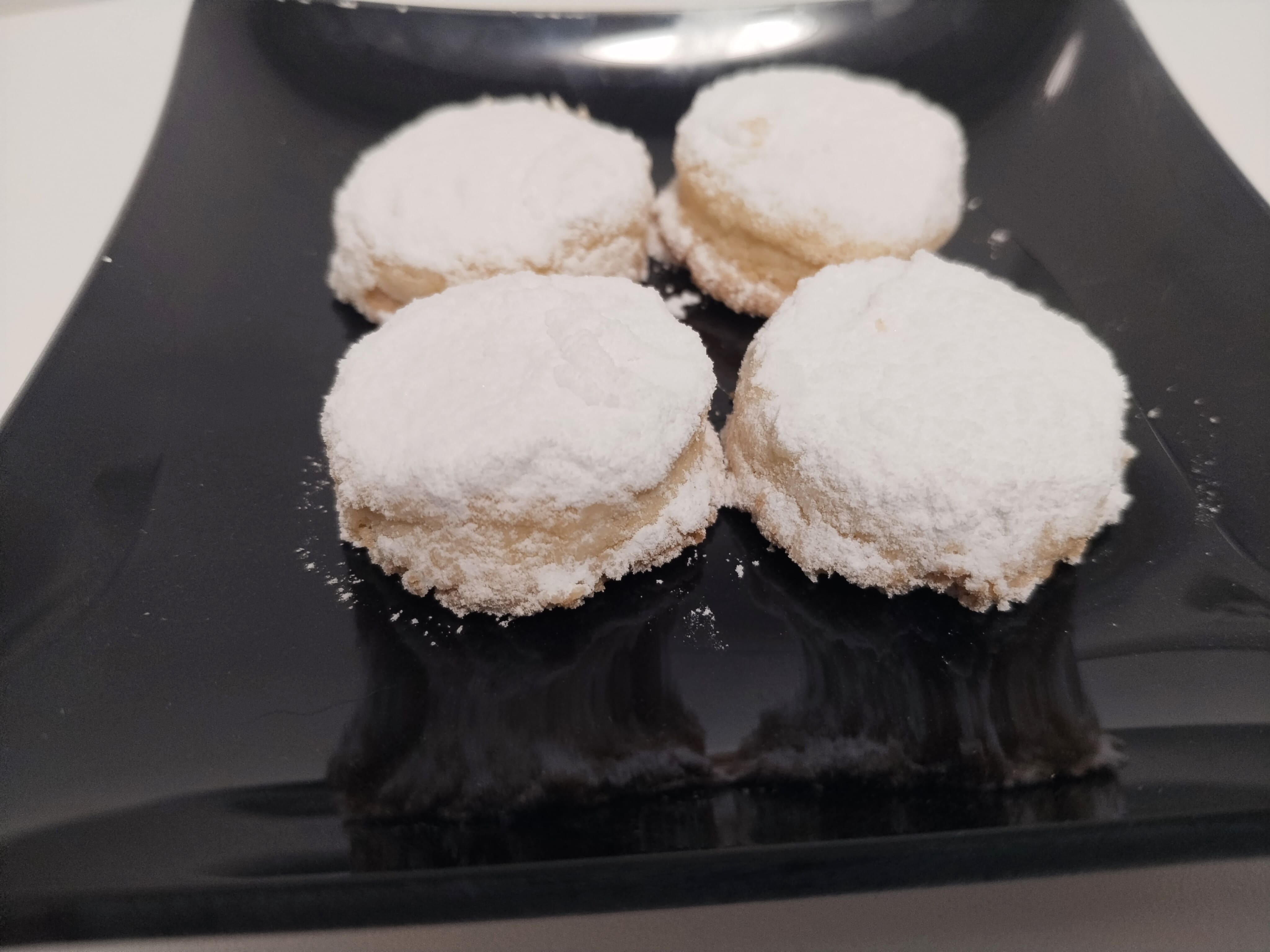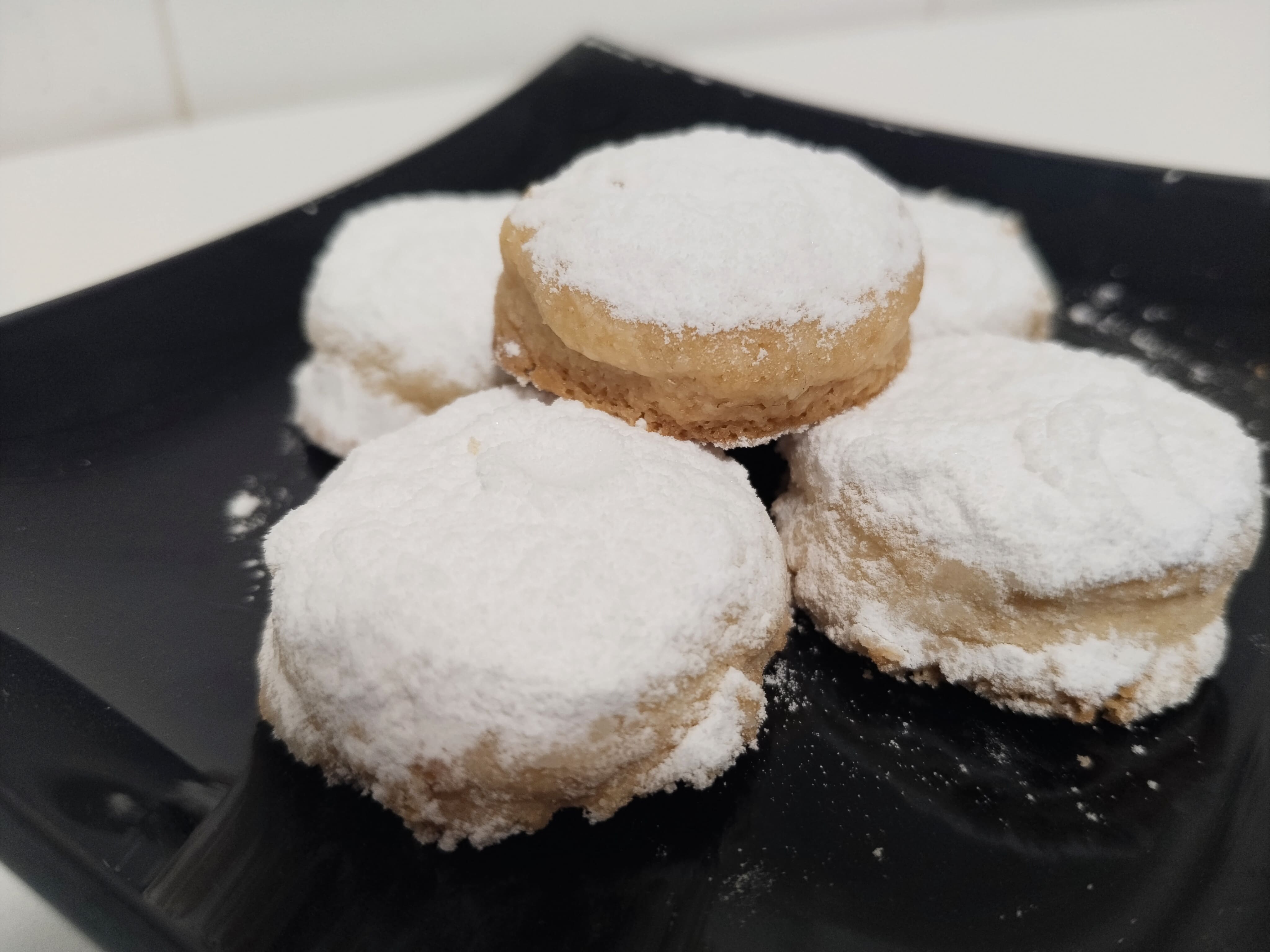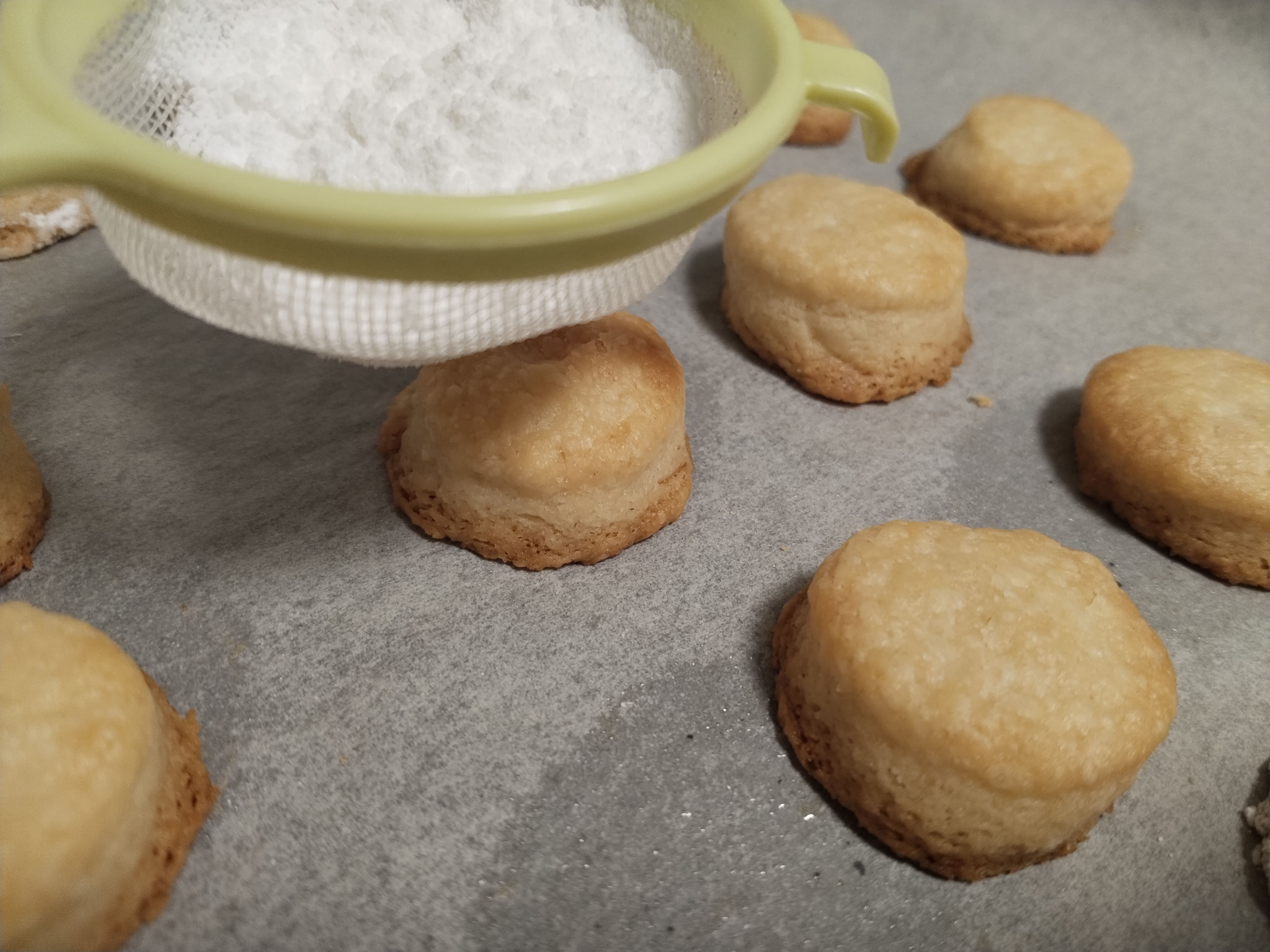 Una vez horneados los sacamos del horno y los dejamos enfriar unos minutos para después, con la ayuda de un colador, los vamos a espolvorear generosamente con el azúcar glas.